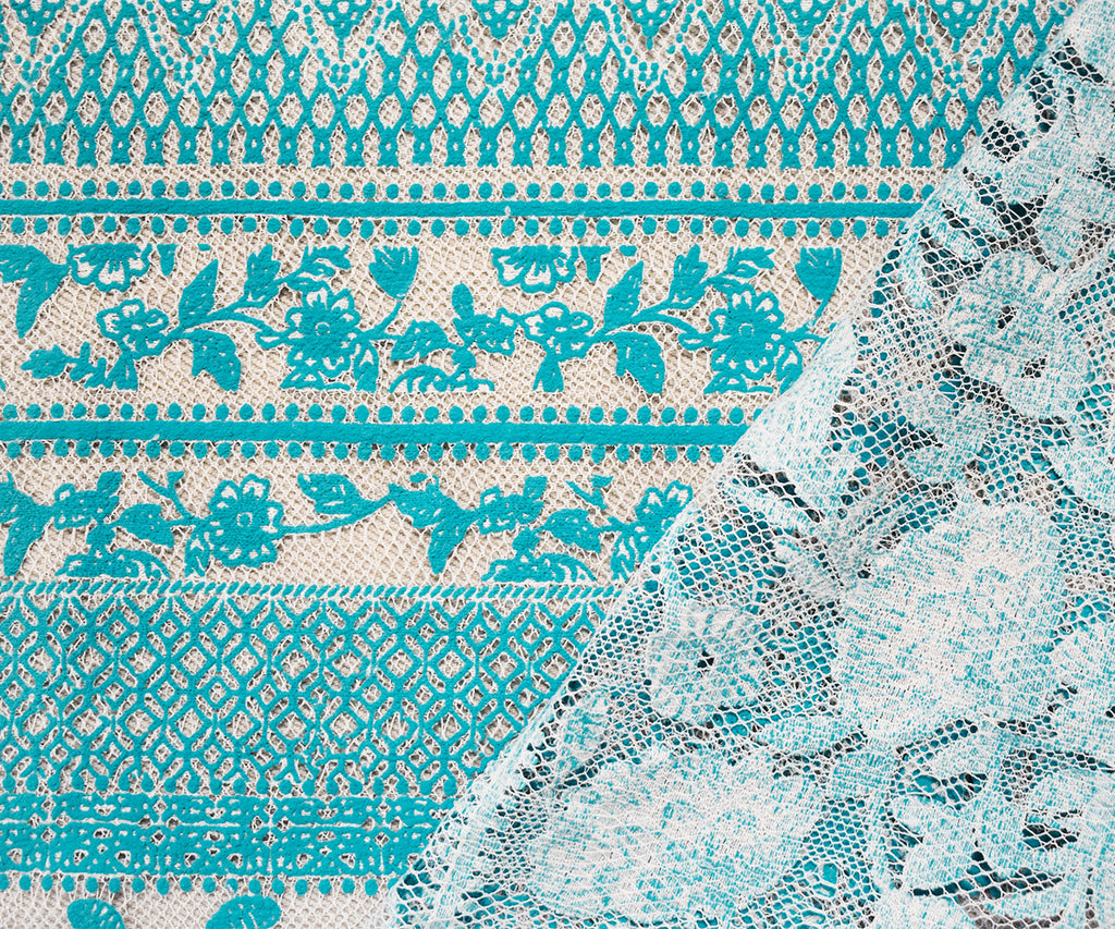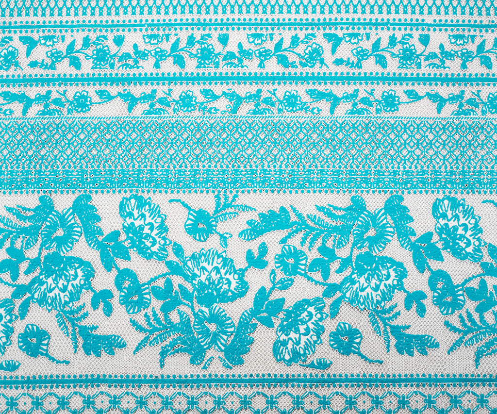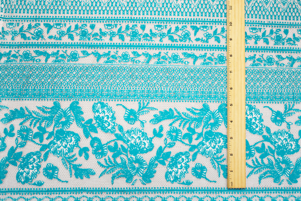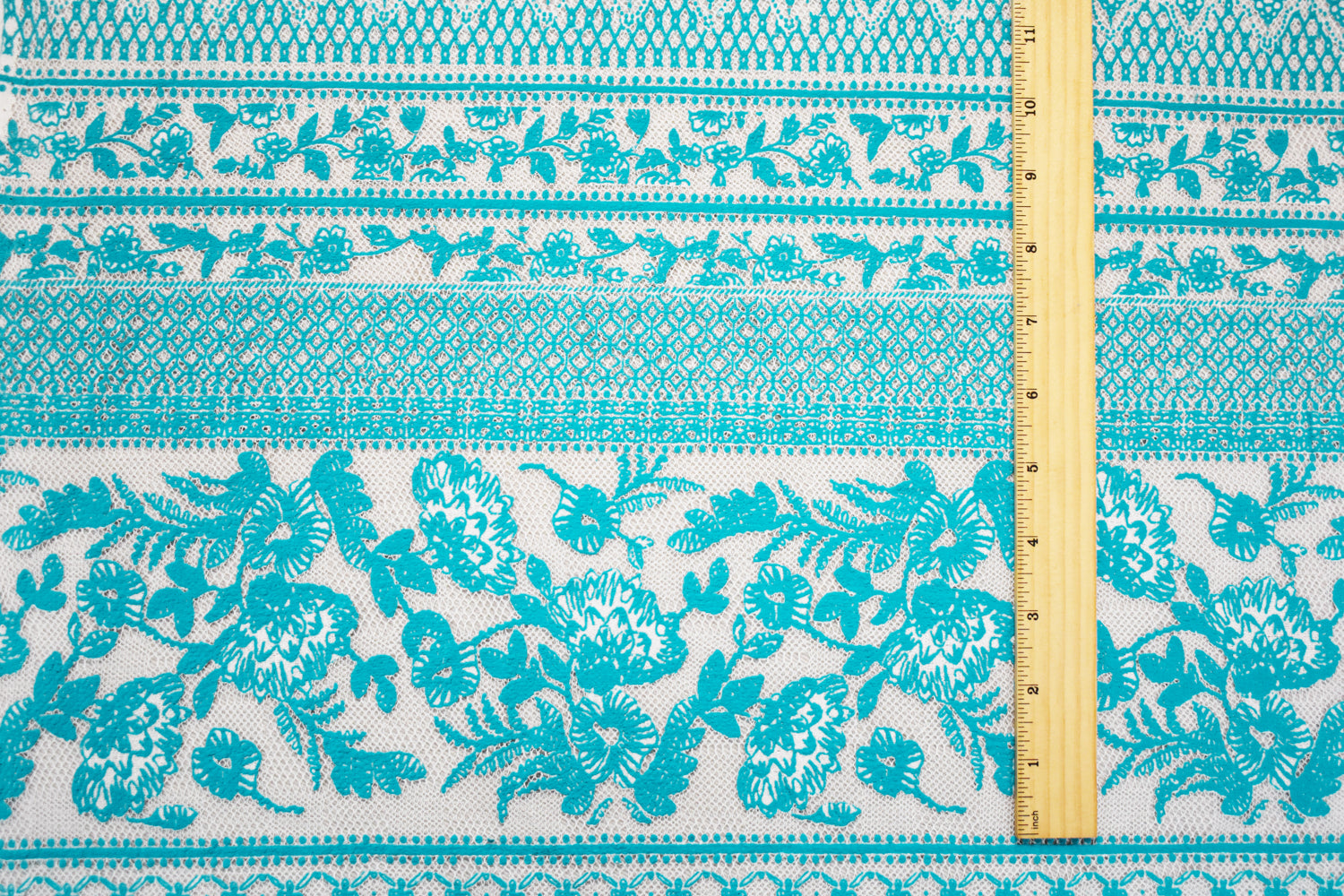 Turquoise-White Nylon Floral Multi Stripe Printed Mesh Lace Knit Fabric