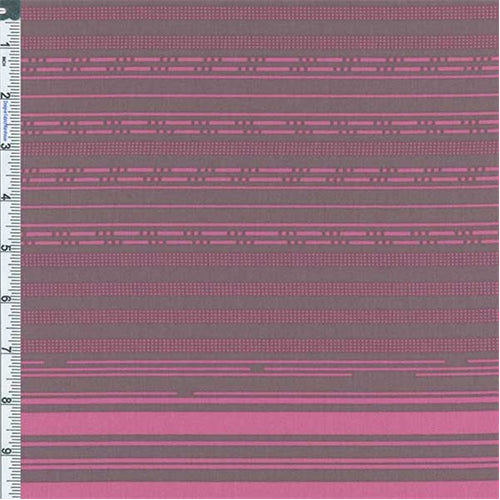 Anna Maria Horner Innocent Crush Mixed Signals horizontal stripe print in shades of grey and hot pink. Light-midweight cotton twill fabric with a smooth softly crisp elegant surface feel, not drapey. Fabric is not fully opaque. Suitable for light-duty home decor accents in tailored styles such as table runners, toss pillows, and drapes