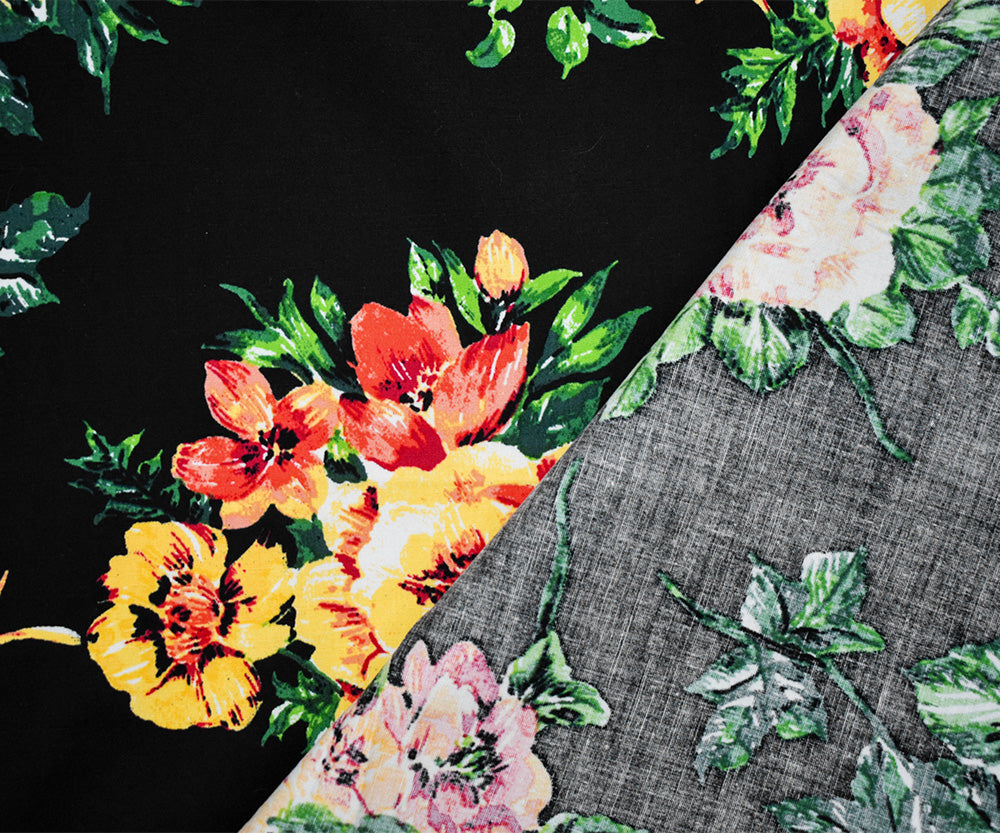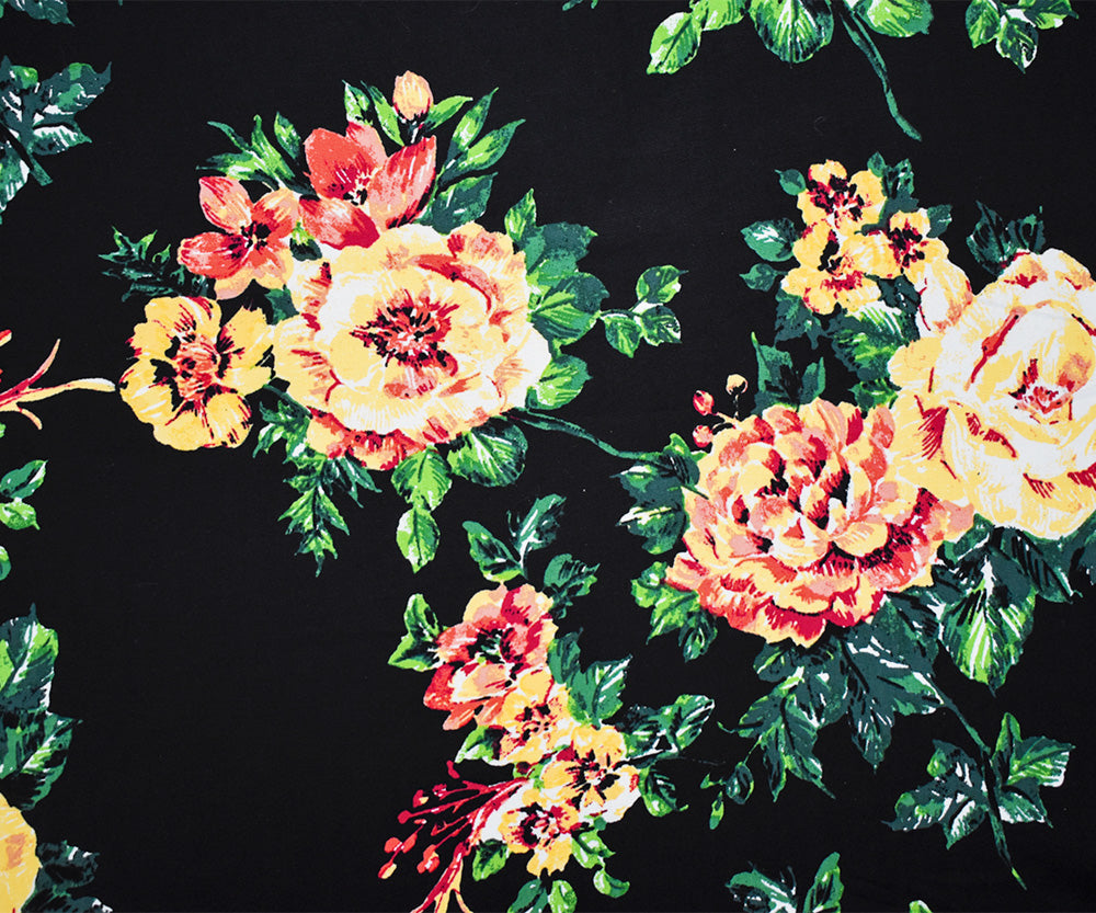 Black-Yellow-Multi Cotton Stretch Spandex Floral Printed Poplin Woven Fabric