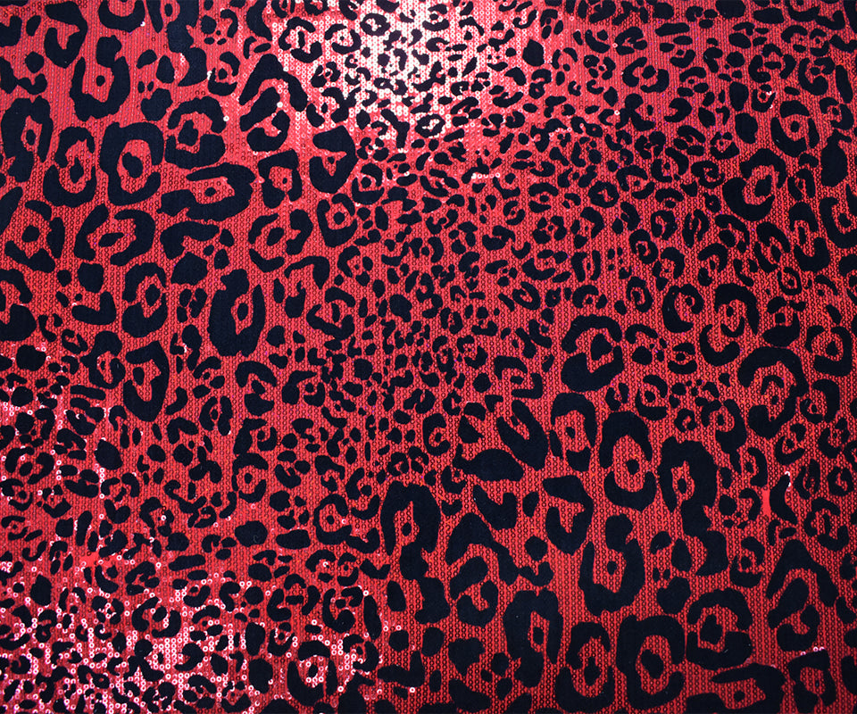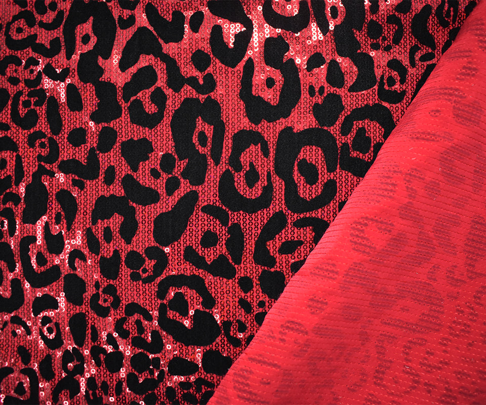 -Polyester fully sequined stretch spandex knit fabric with a velvet flocked leopard print