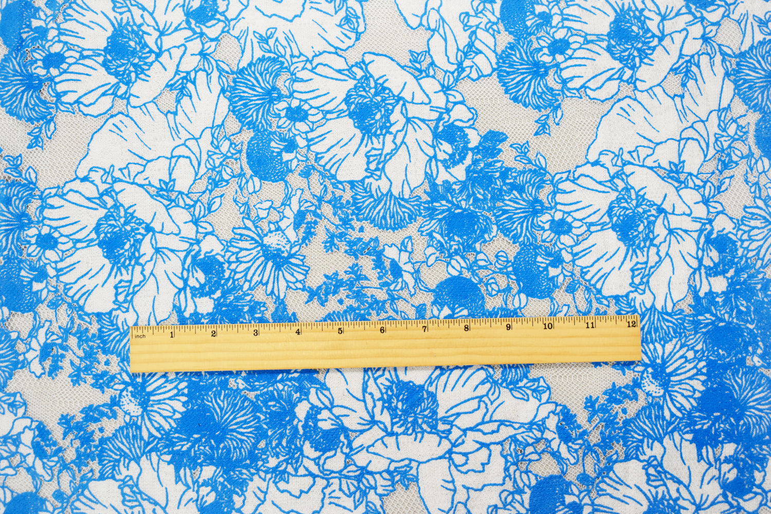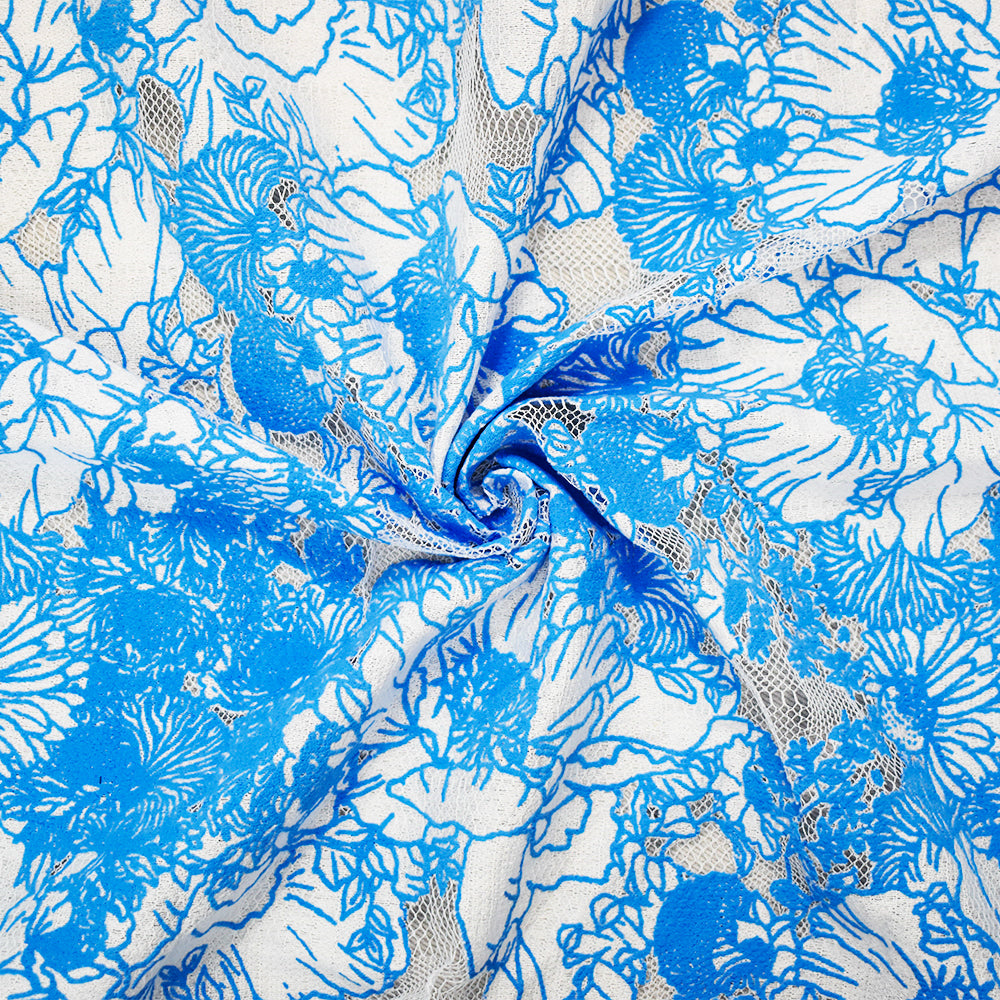Blue-White Cotton Nylon Floral Printed Lace Mesh Knit Fabric