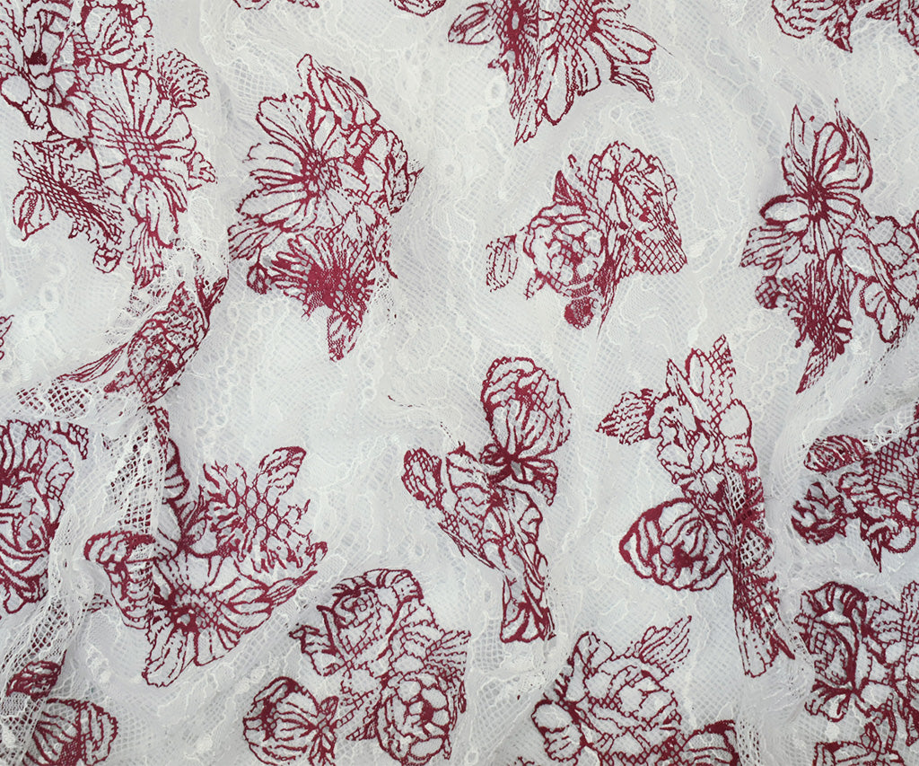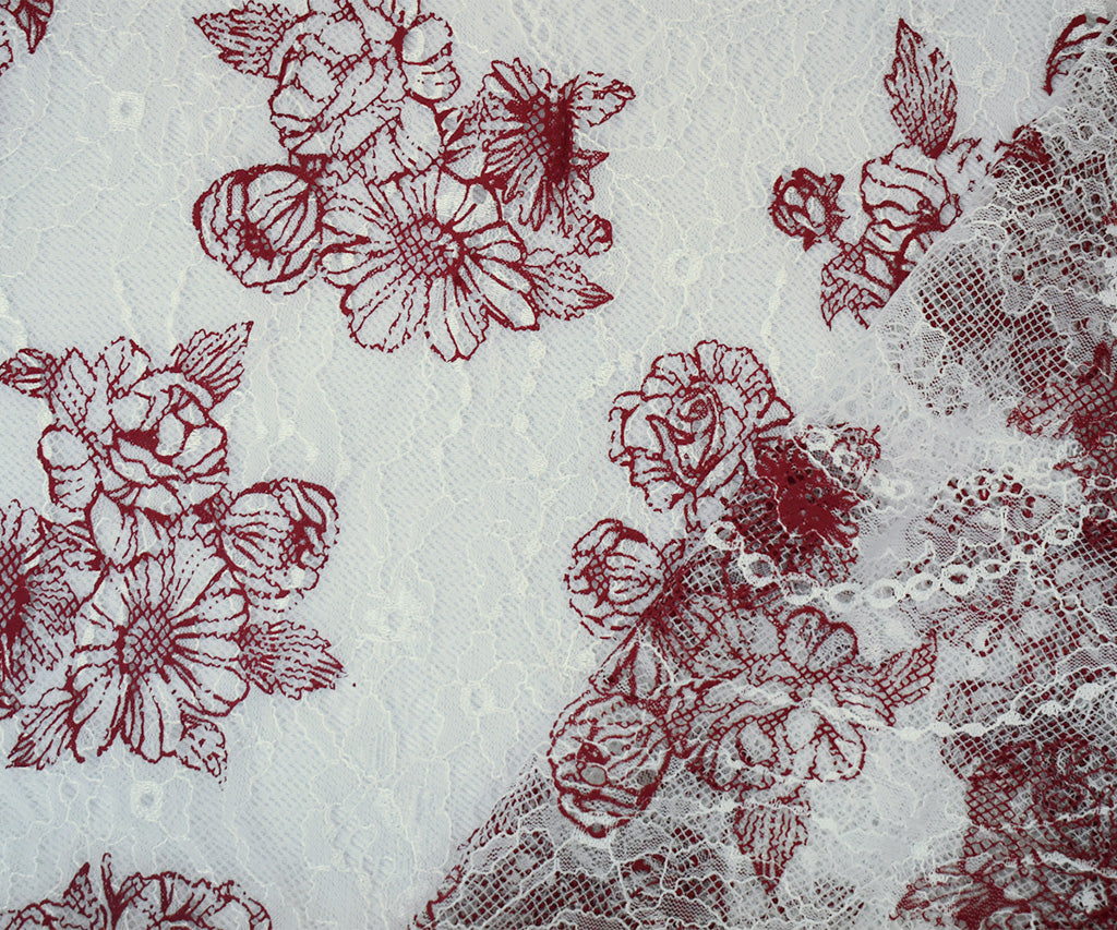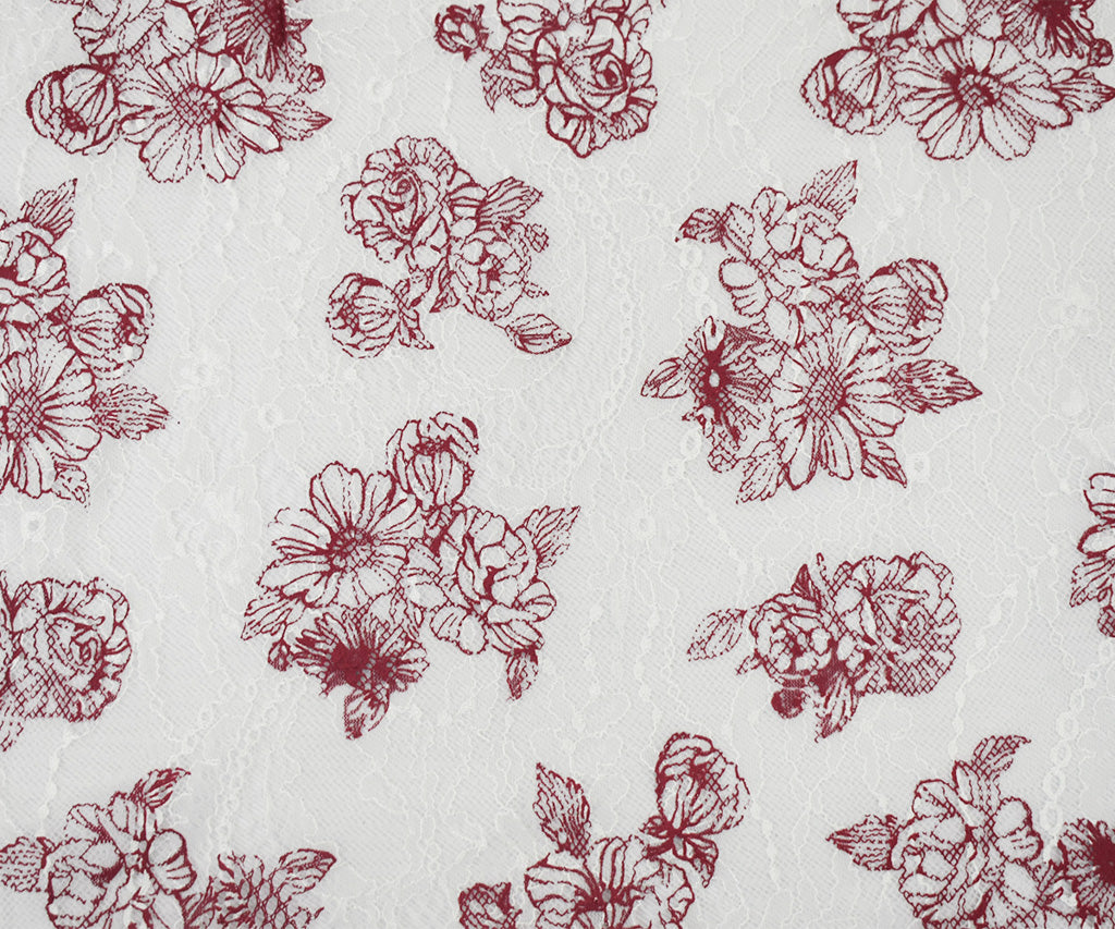 White-Deep Red Nylon Floral Printed Lace Mesh Knit Fabric