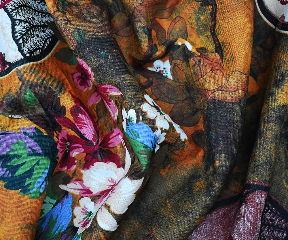 -100% linen plain woven fabric printed with an artistic floral patterns with paint brush textures and circular shapes. Line if needed.