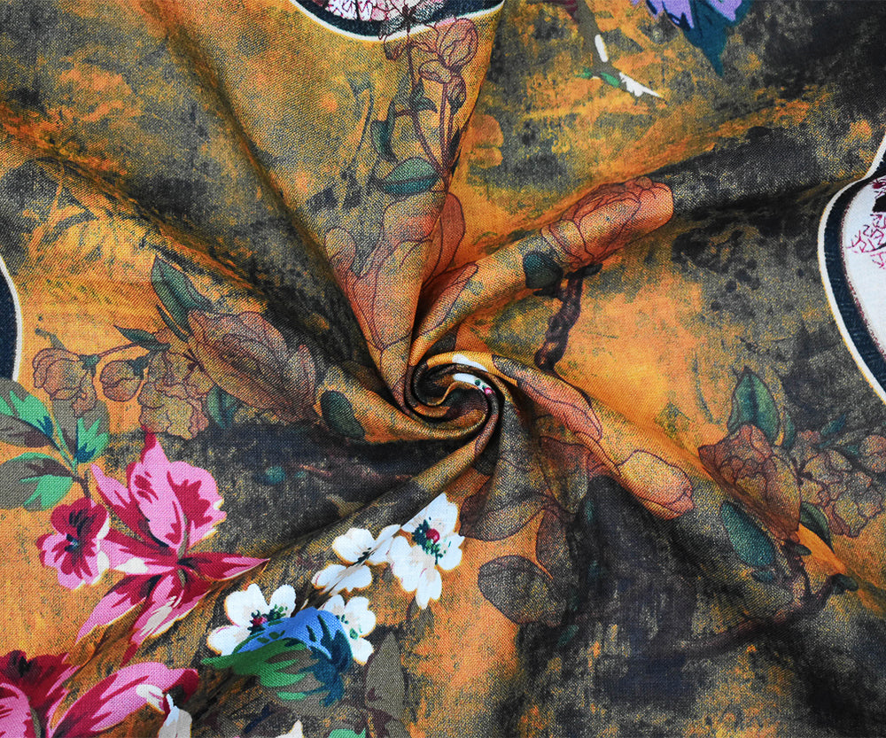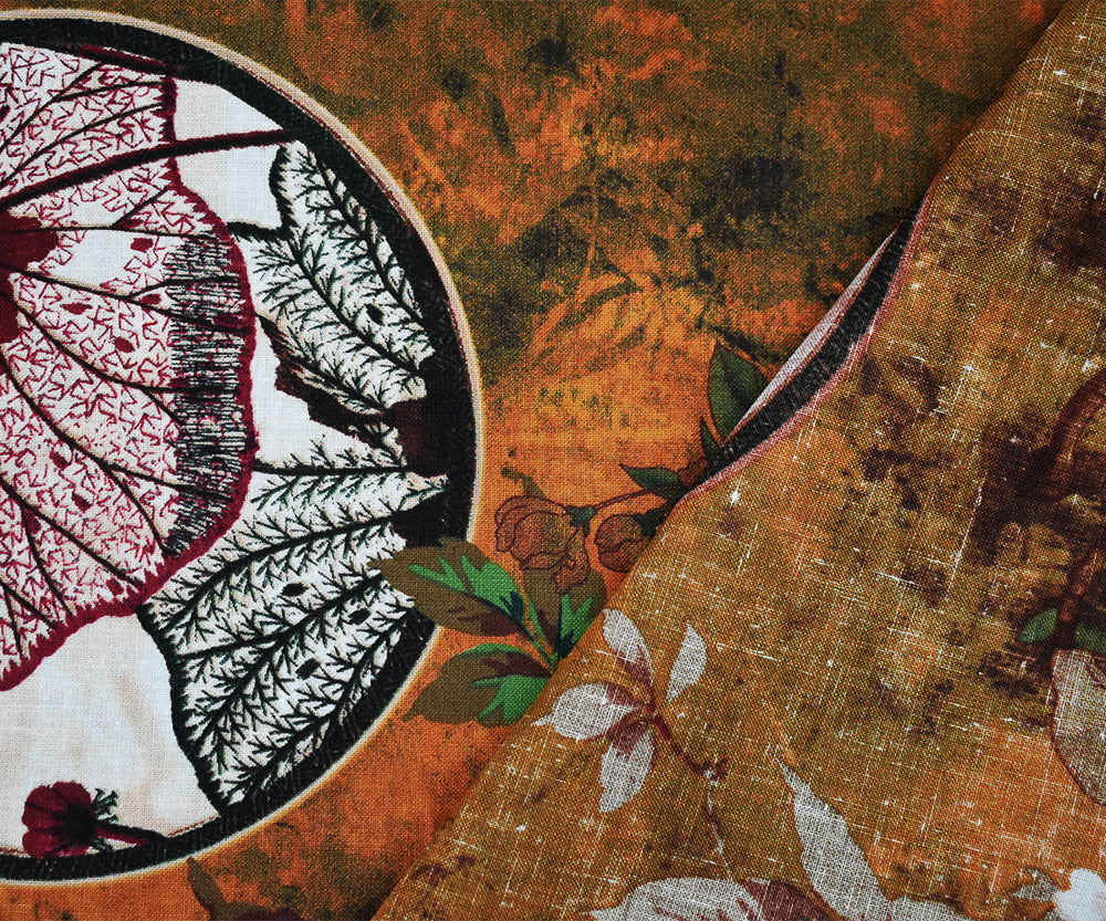 Orange-Red-Multi Floral Circle Art Printed Linen Woven Fabric