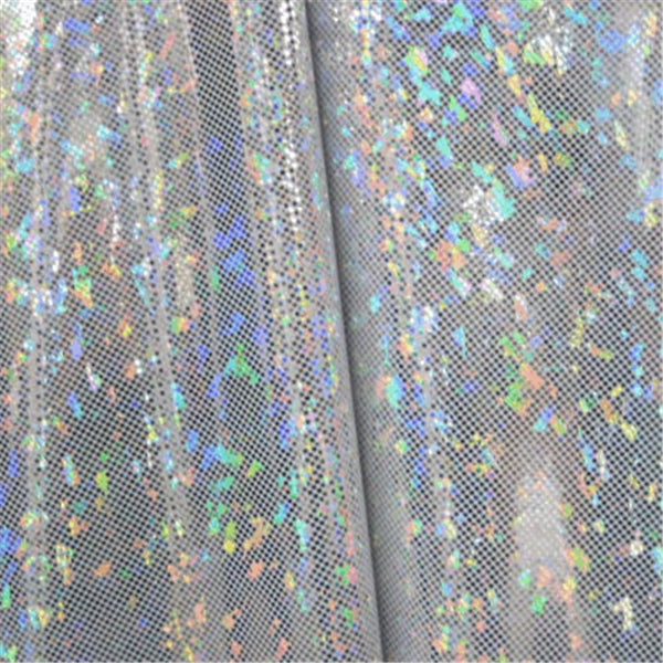 Metallic Silver Shattered Glass Hologram Print on White Spandex Fabric