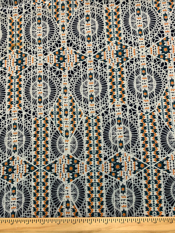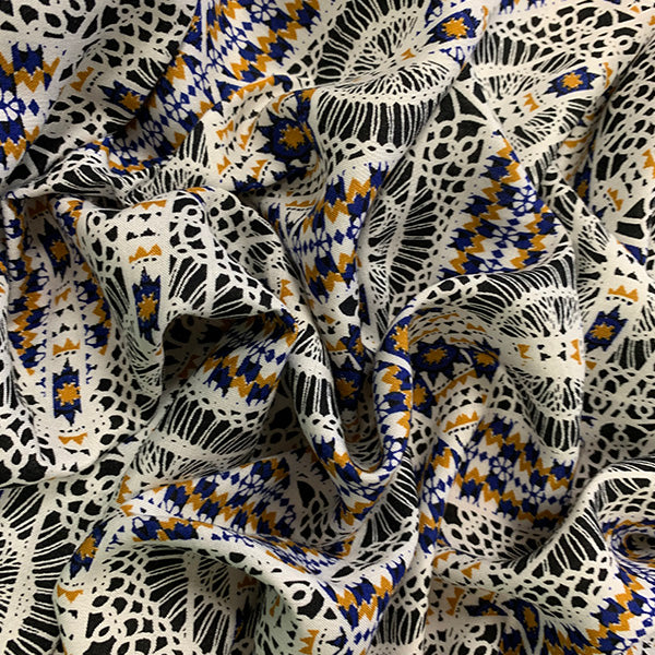 Blue and Gold Lace Look Print Rayon Challis Fabric
