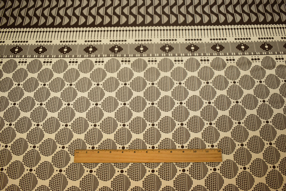 -100% silk jersey knit fabric printed with a multi dotted pattern, scalloped elements in a striped arrangement. Line if needed.