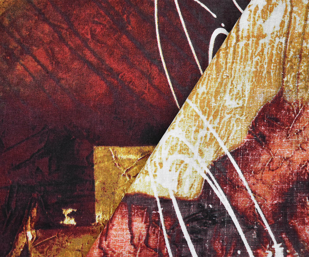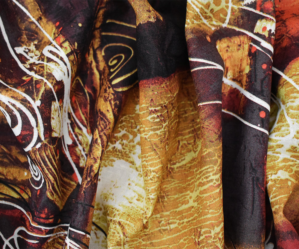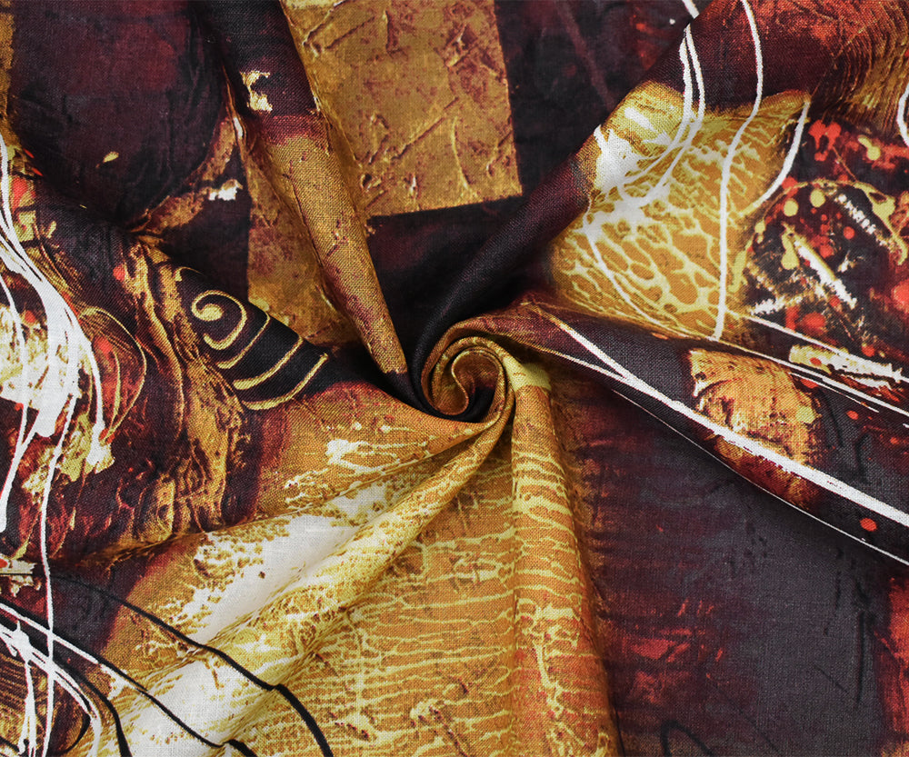 Brown-Yellow-Multi Abstract Art Printed Linen Woven Fabric
