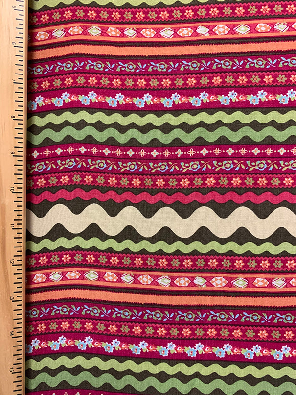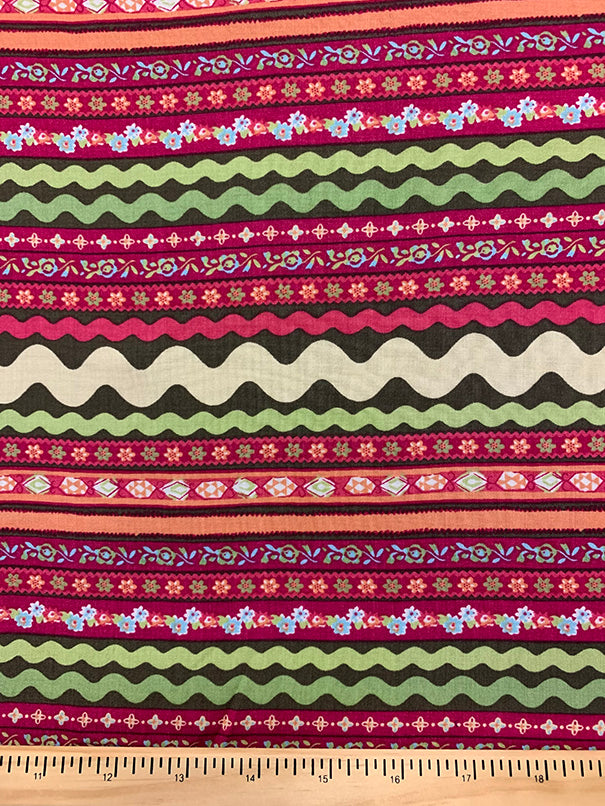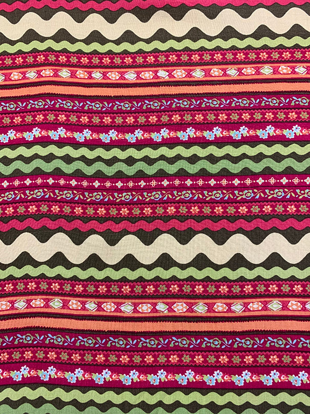 -Magenta, Green, Yellow, Blue, White, & Brown Multi Horizontal Stripe Print Rayon Challis Fabric