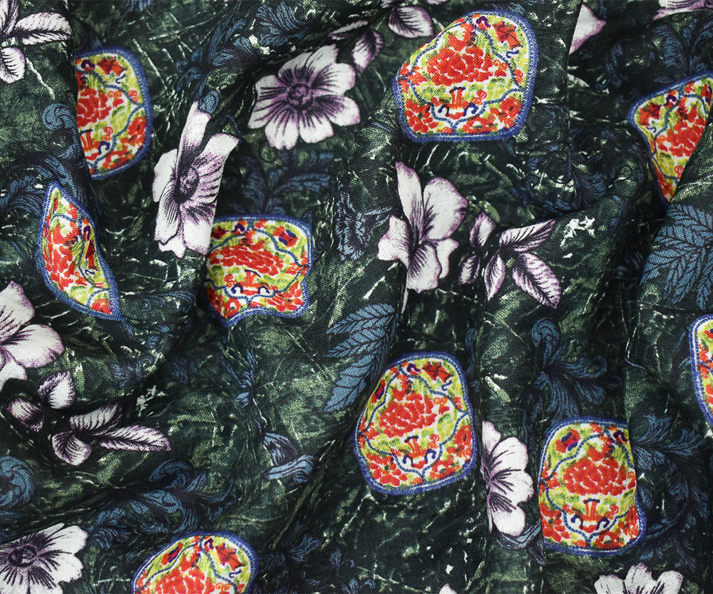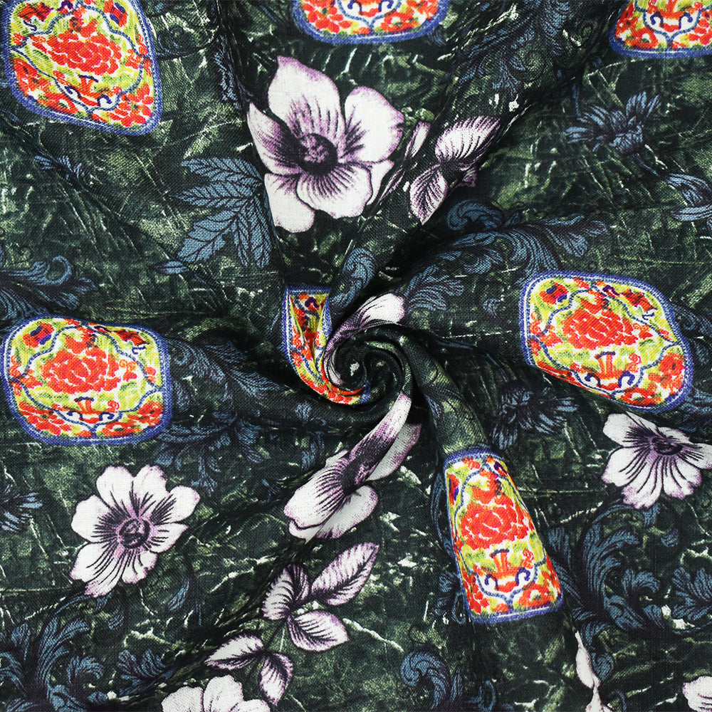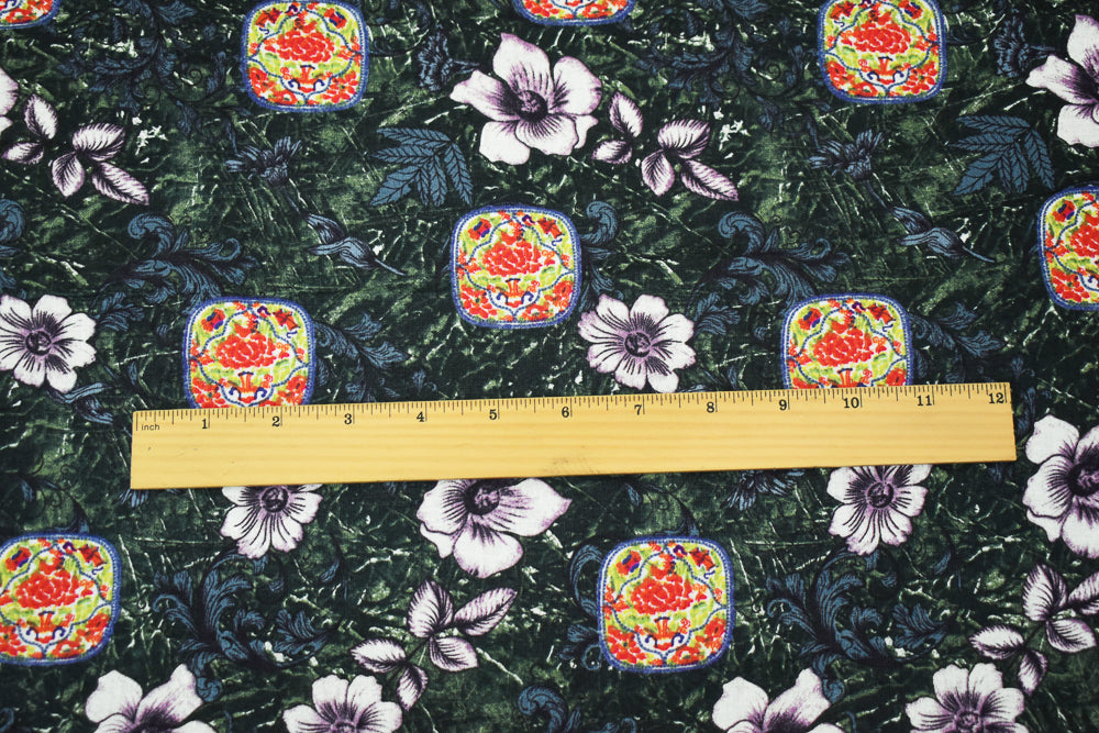 Navy-Purple-Multi Floral and Tile Pattern Printed Linen Woven Fabric