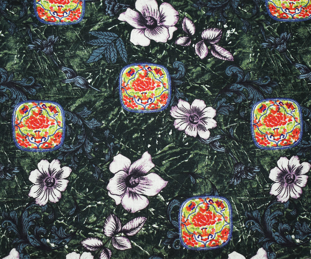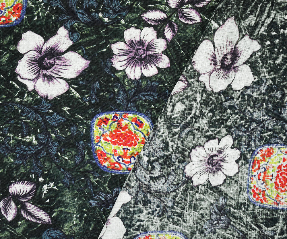 -100% linen plain woven fabric printed with multi elements of florals tile-like patterns and baroque elements. Line if needed.