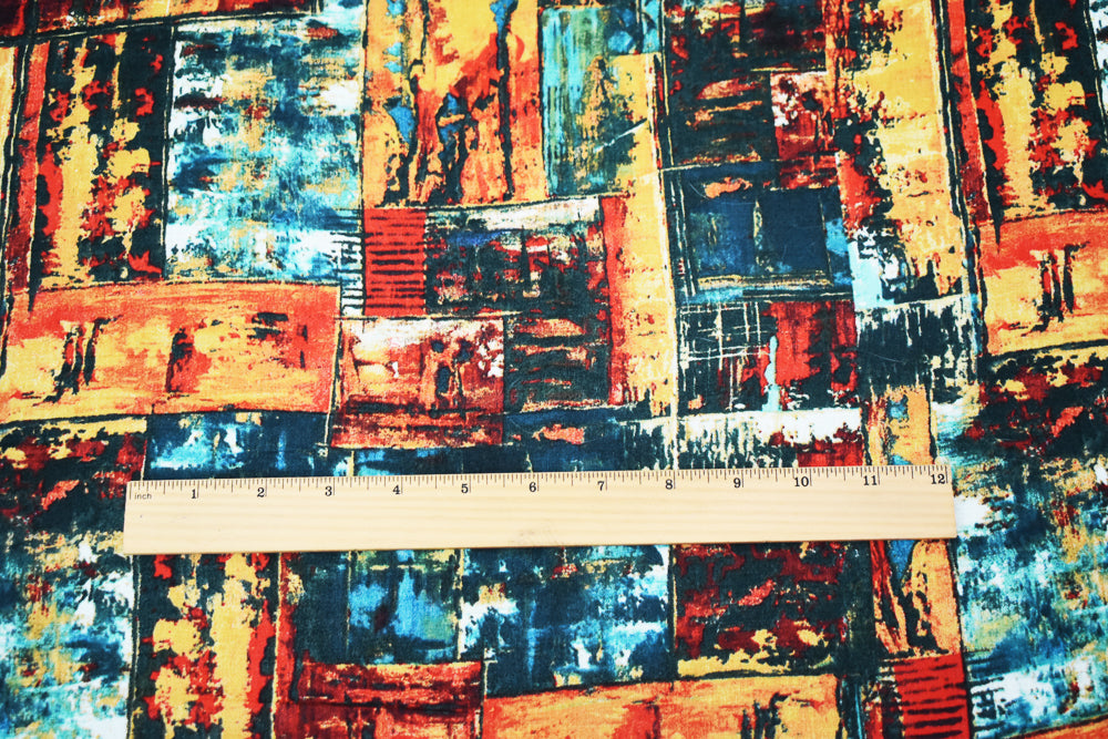 Orange-Teal-Multi Abstract Art Printed Linen Woven Fabric