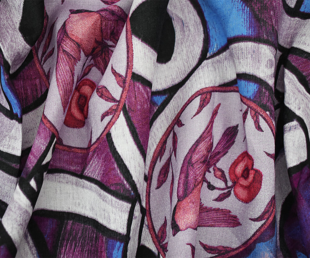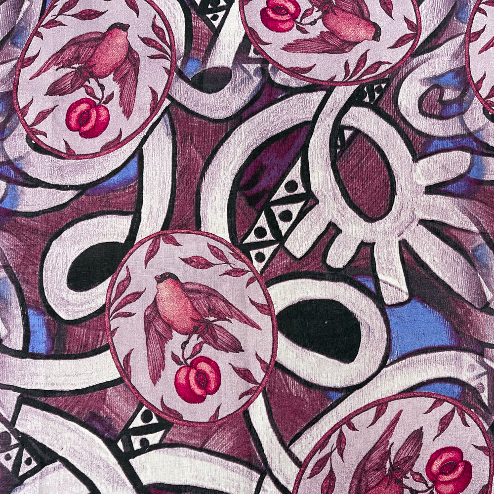 Purple-Blue-Multi Abstract Bird Fruit Pattern Printed Linen Woven Fabric