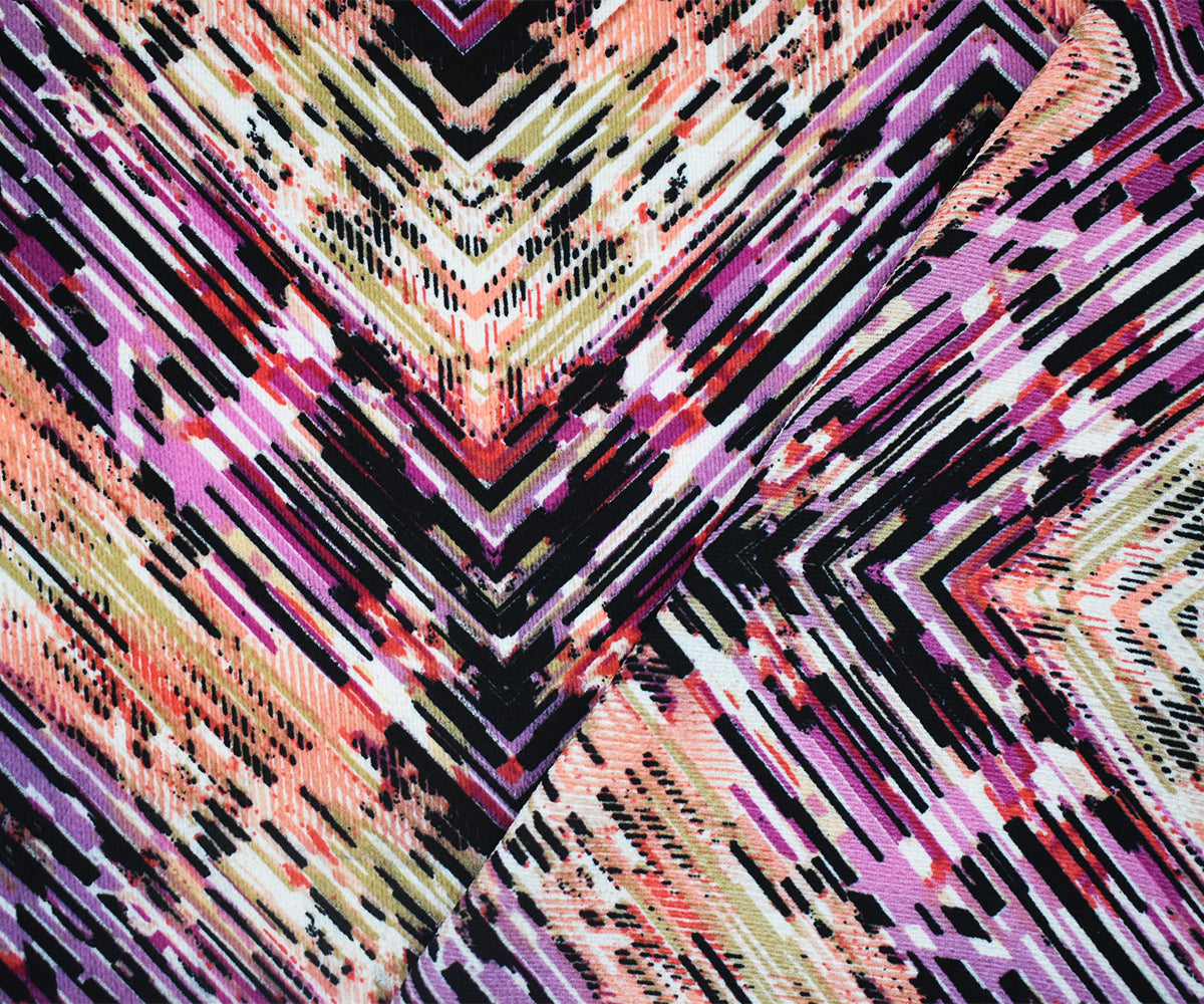 Purple-Coral-Multi Poly Abstract Tribal Chevron Printed Crepe Woven Fabric