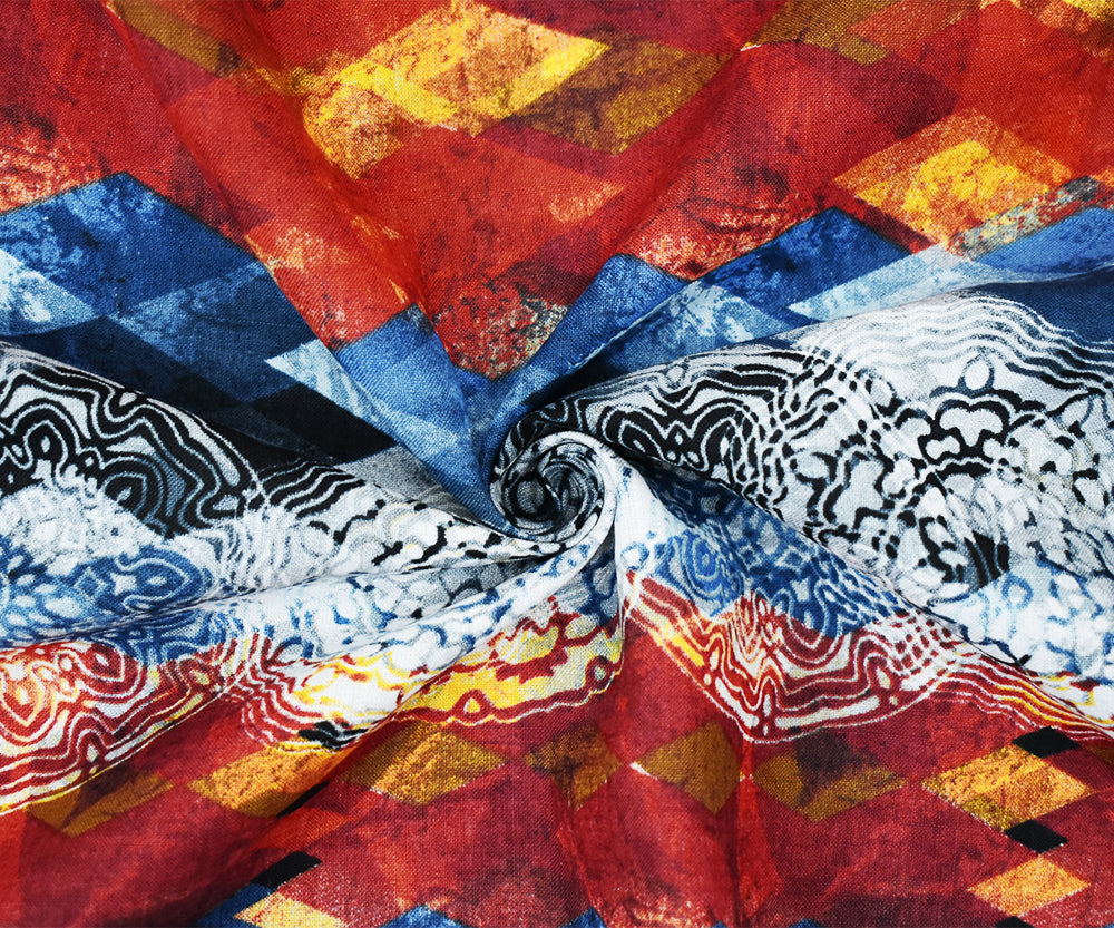 Red-Blue-Multi Diamond Medallion Pattern Printed Linen Woven Fabric