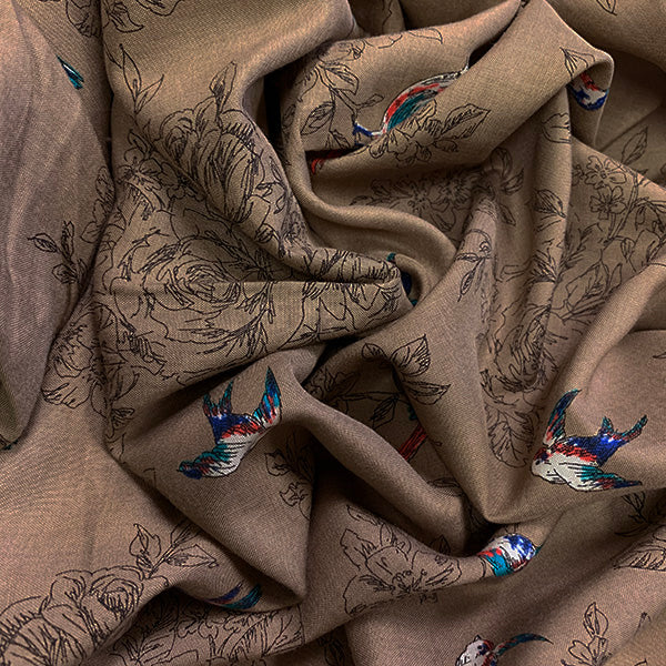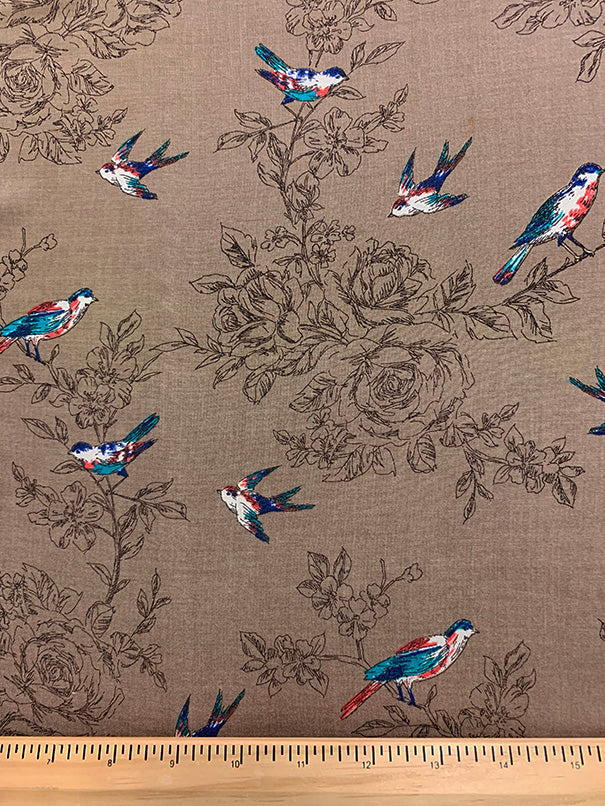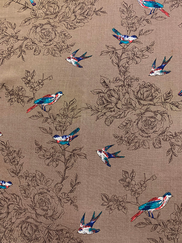 Tan Bird Print Rayon Challis Fabric