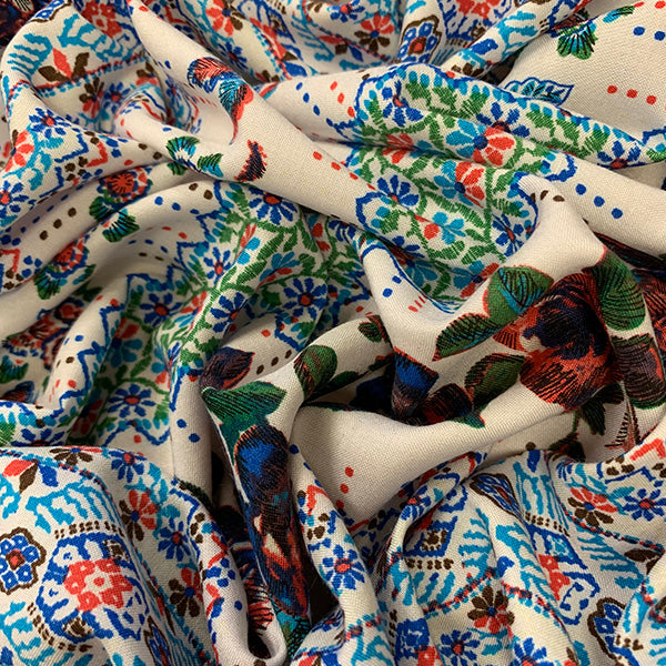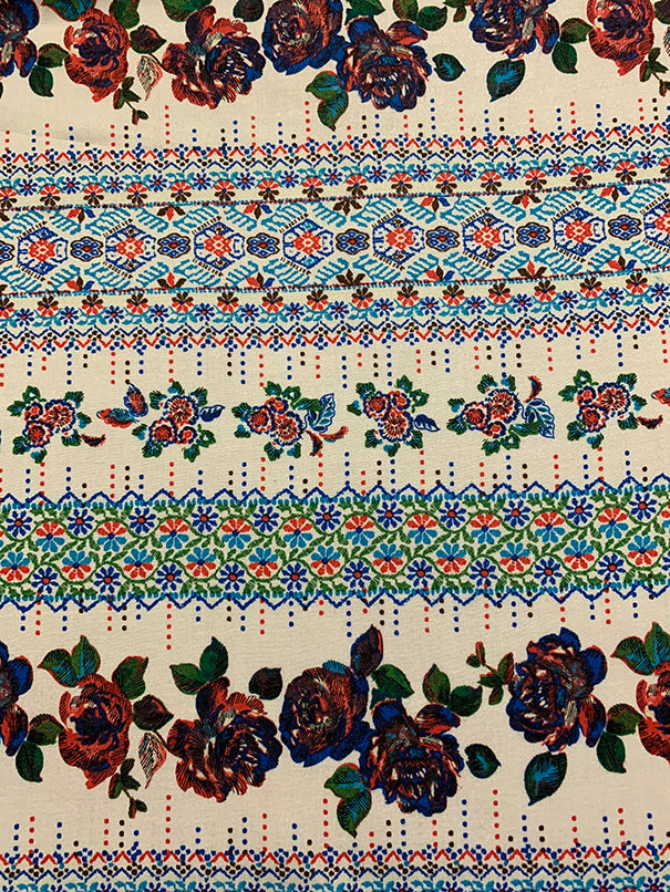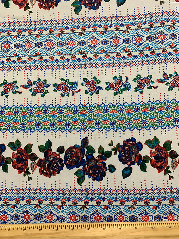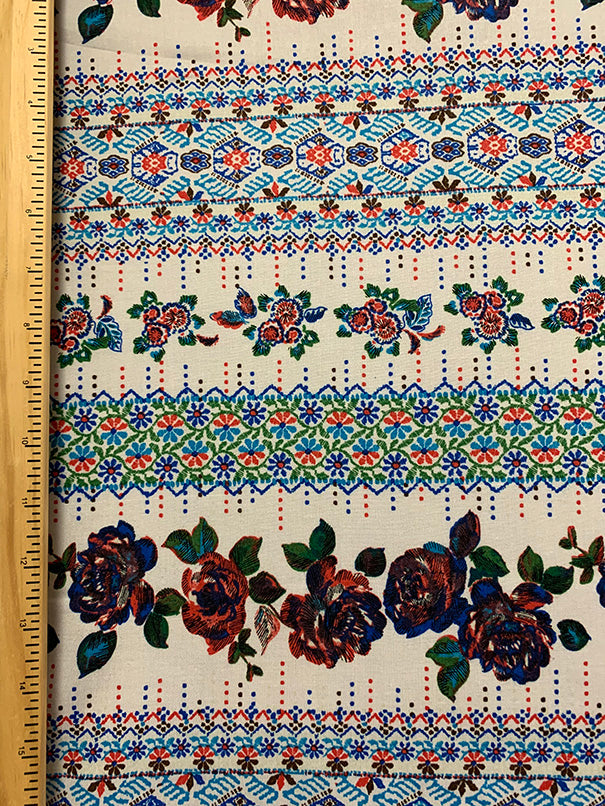 White Floral Stripe Print Rayon Challis Fabric