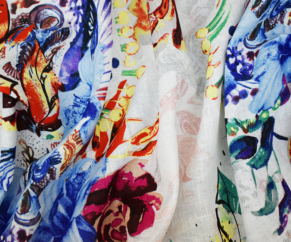 White-Fuchsia-Multi Floral Art Pattern Printed Linen Woven Fabric