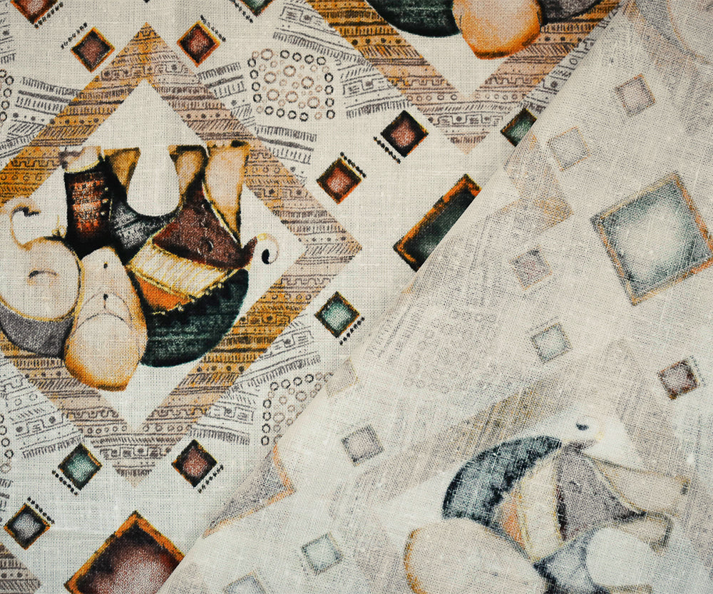 White-Yellow-Multi Elephant Diamond Pattern Printed Linen Woven Fabric