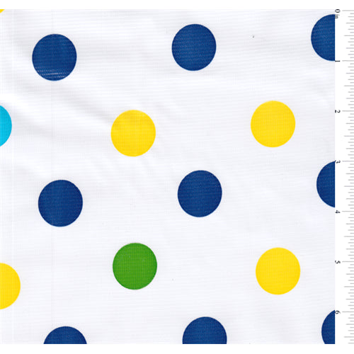 Blue, Turquoise, Green, & Yellow 1" Polka Dot Print on White Oilcloth Fabric Great for your breakfast or dinner table, patio, parties, BBQ's or picnic tables. Many use oilcloth for baby play areas, sewing/art projects, bags, totes, book covers, runners, placemats, gifts, or scrapbooks. Durable even when used with hot plates Easy to wipe clean with warm, soapy sponge Face is 100% PVC Back is 65% Polyester 35% Cotton Mesh 45" Wide Waterproof and protected with a clear finish Fade, stain, and soil resistant Imported from Mexico Usually $120.00/roll