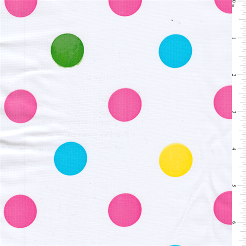 Pink, Green, Yellow, & Turquoise 1" Polka Dot Print on White Oilcloth Fabric Great for your breakfast or dinner table, patio, parties, BBQ's or picnic tables. Many use oilcloth for baby play areas, sewing/art projects, bags, totes, book covers, runners, placemats, gifts, or scrapbooks. Durable even when used with hot plates Easy to wipe clean with warm, soapy sponge Face is 100% PVC Back is 65% Polyester 35% Cotton Mesh 45" Wide Waterproof and protected with a clear finish Fade, stain, and soil resistant Imported from Mexico Usually $120.00/roll