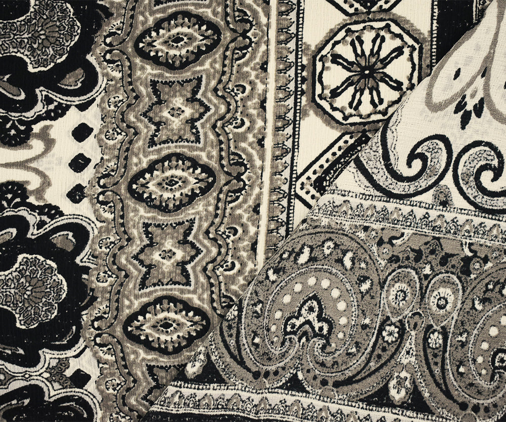 -100% polyester crepe georgette with straited like textures printed with baroque and paisley patterns in a stripe arrangement