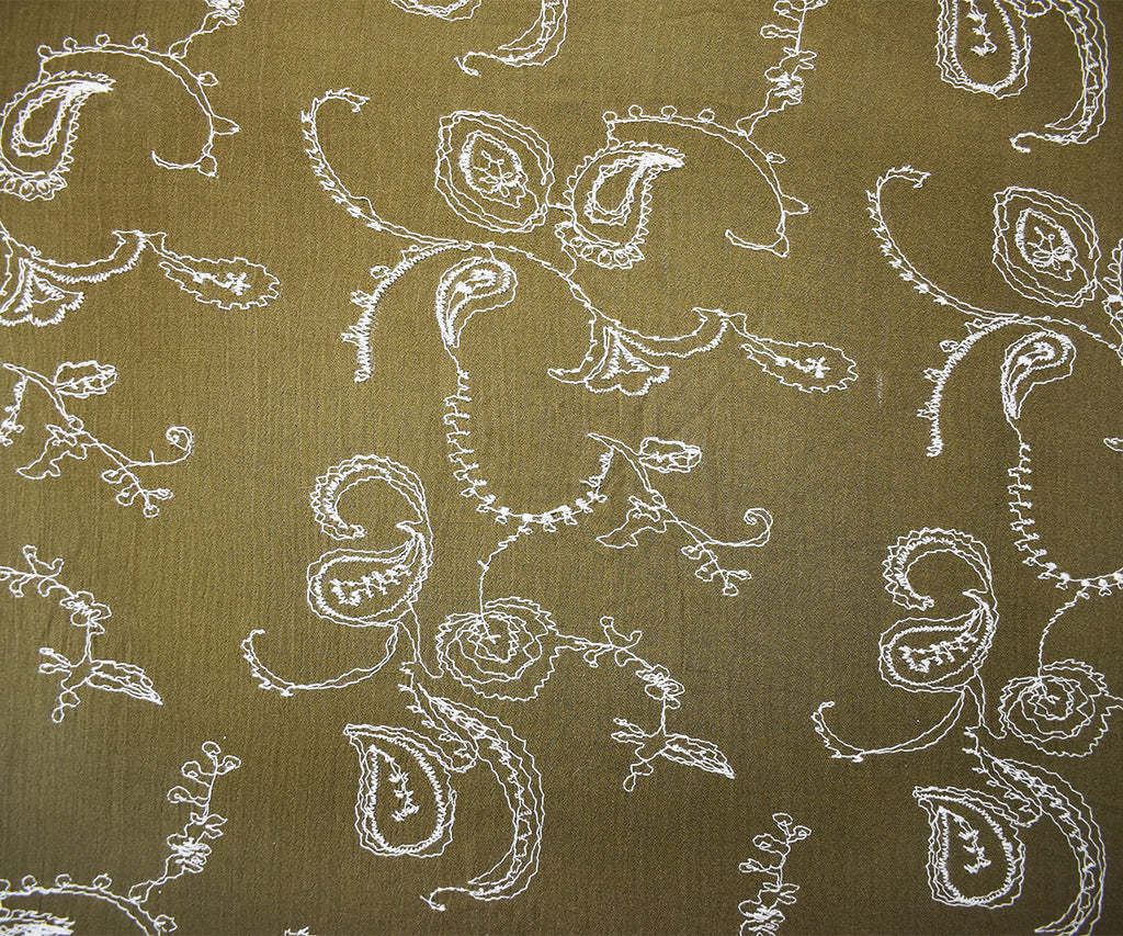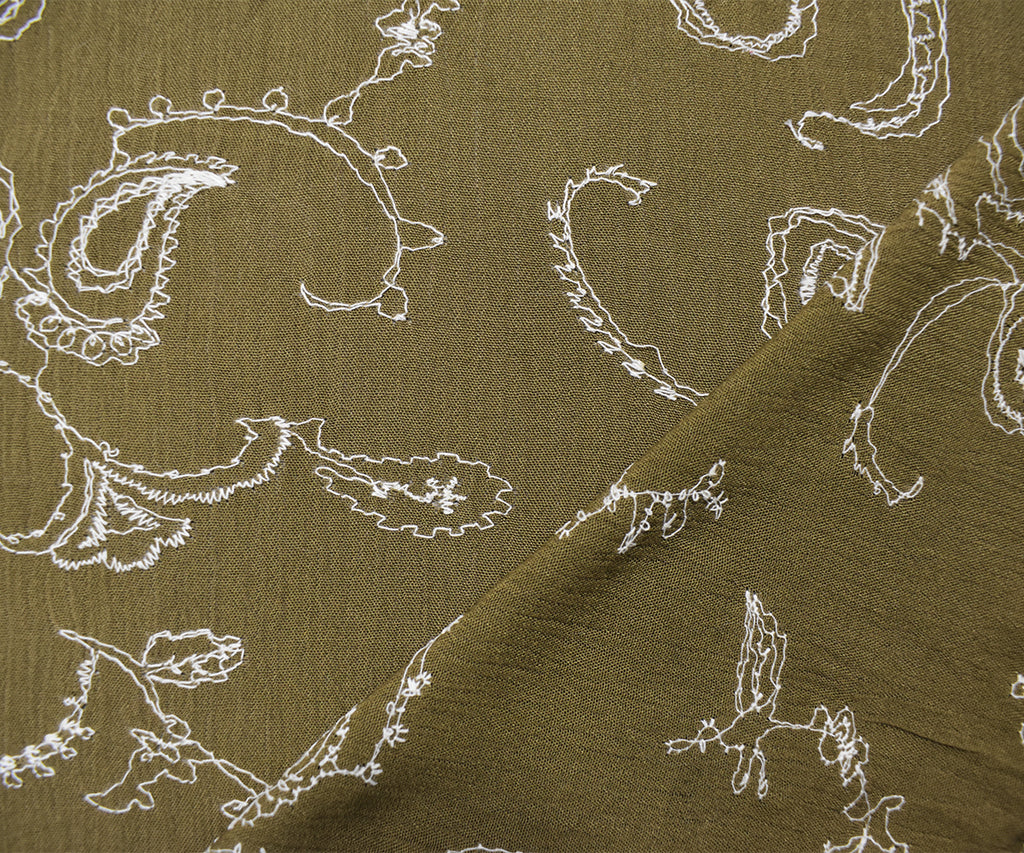 -100% cotton crinkled gauze woven fabric embroidered with a paisley vine-like pattern with florals.