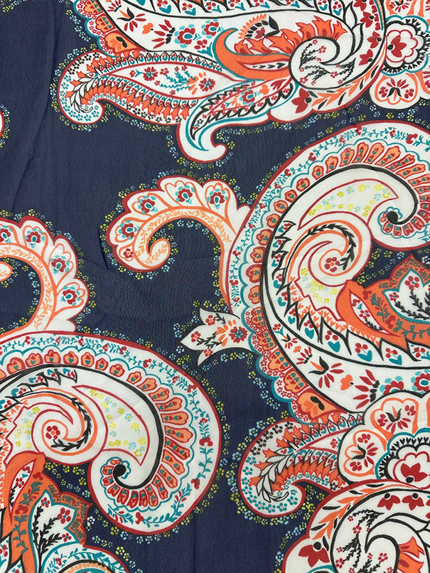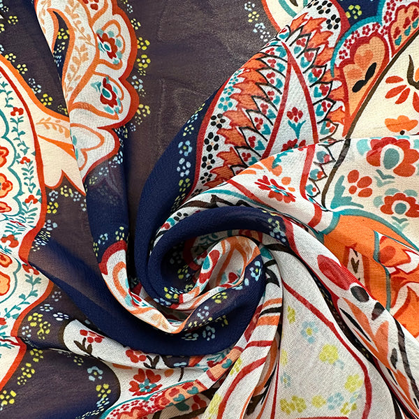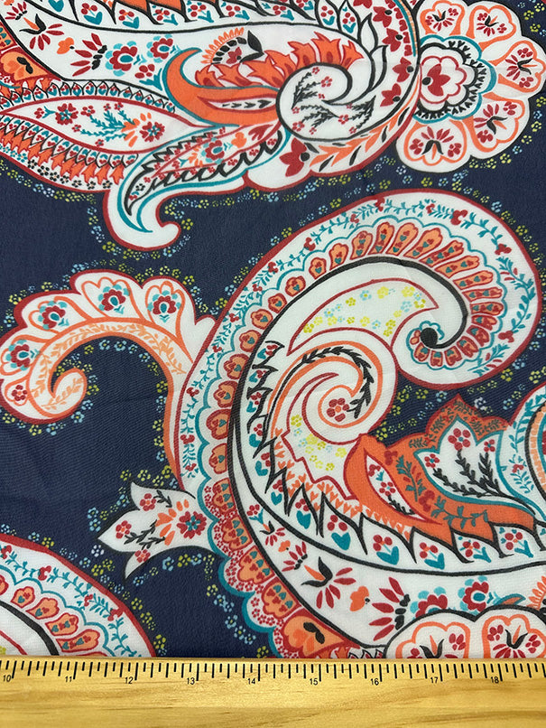 -Dark Blue, White, Yellow, Aqua, Teal, Red, Blac, & Coral Floral Paisley Print Poly Sheer Chiffon Fabric