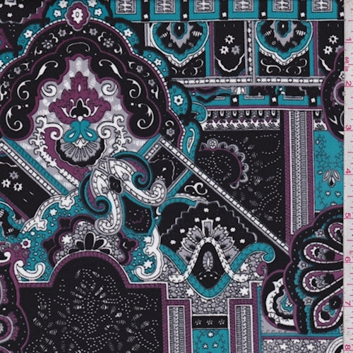 1 1/2 YD PC-Black/Teal/Purple Moroccan Crepe Georgette Fabric
