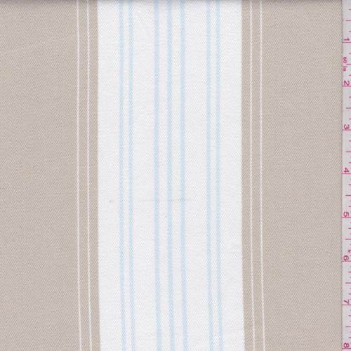 Dark tan, white and powder blue vertical stripes. This cotton fabric has been washed and laundered, giving it a soft hand.