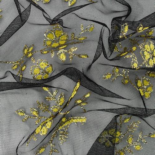 4 YD PC-Black/Yellow/Gold Floral Glitter/Bead Flock Mesh Fabric