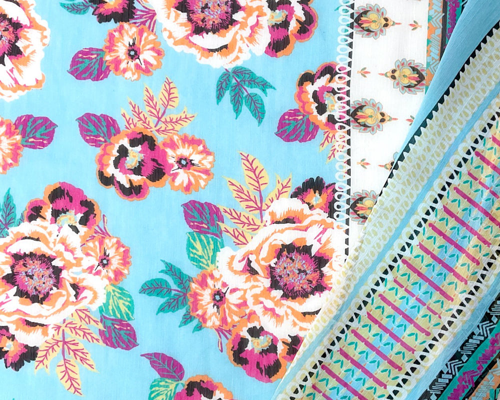 Blue-Multi Poly Floral Border Printed Yoryu Chiffon Woven Fabric
