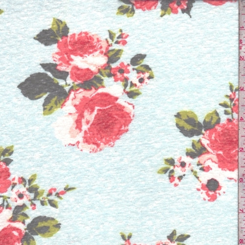 Spa Blue/Red Rose Slub Jersey Knit Fabric