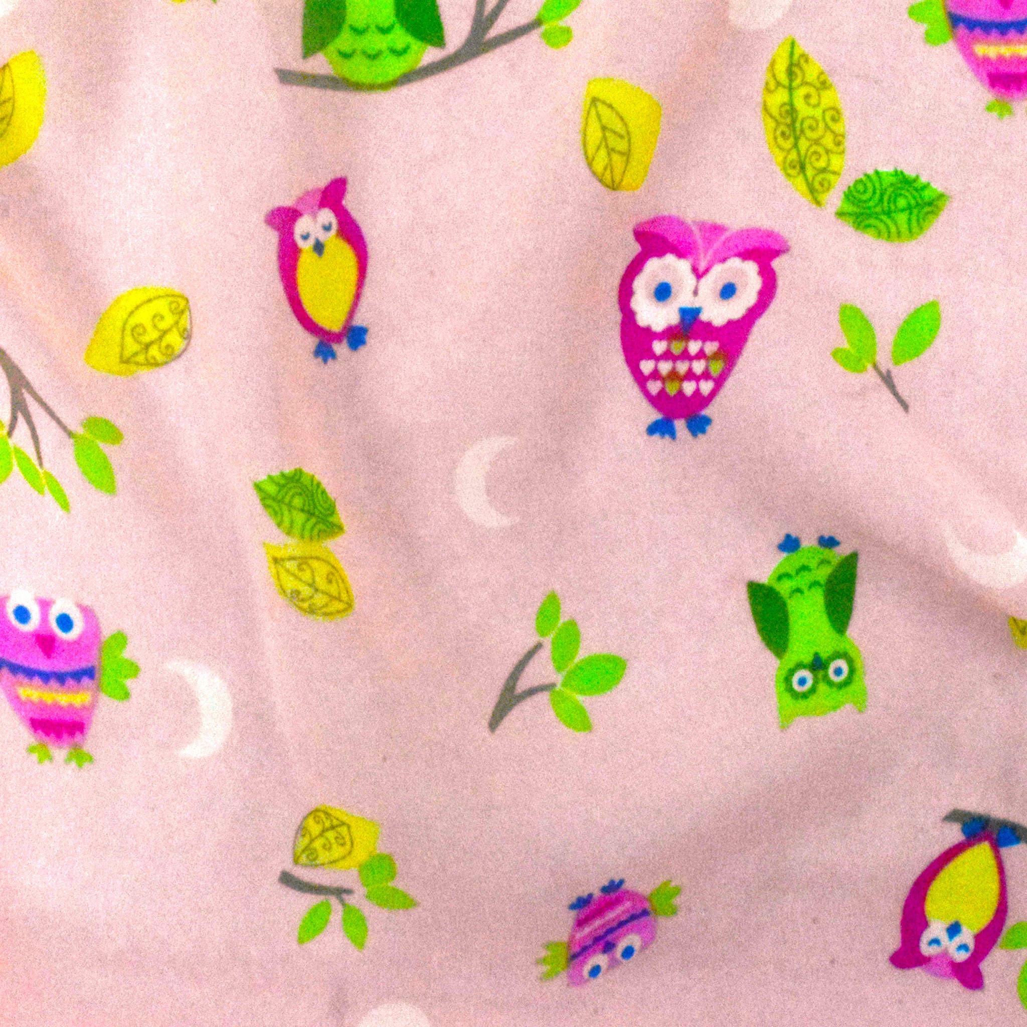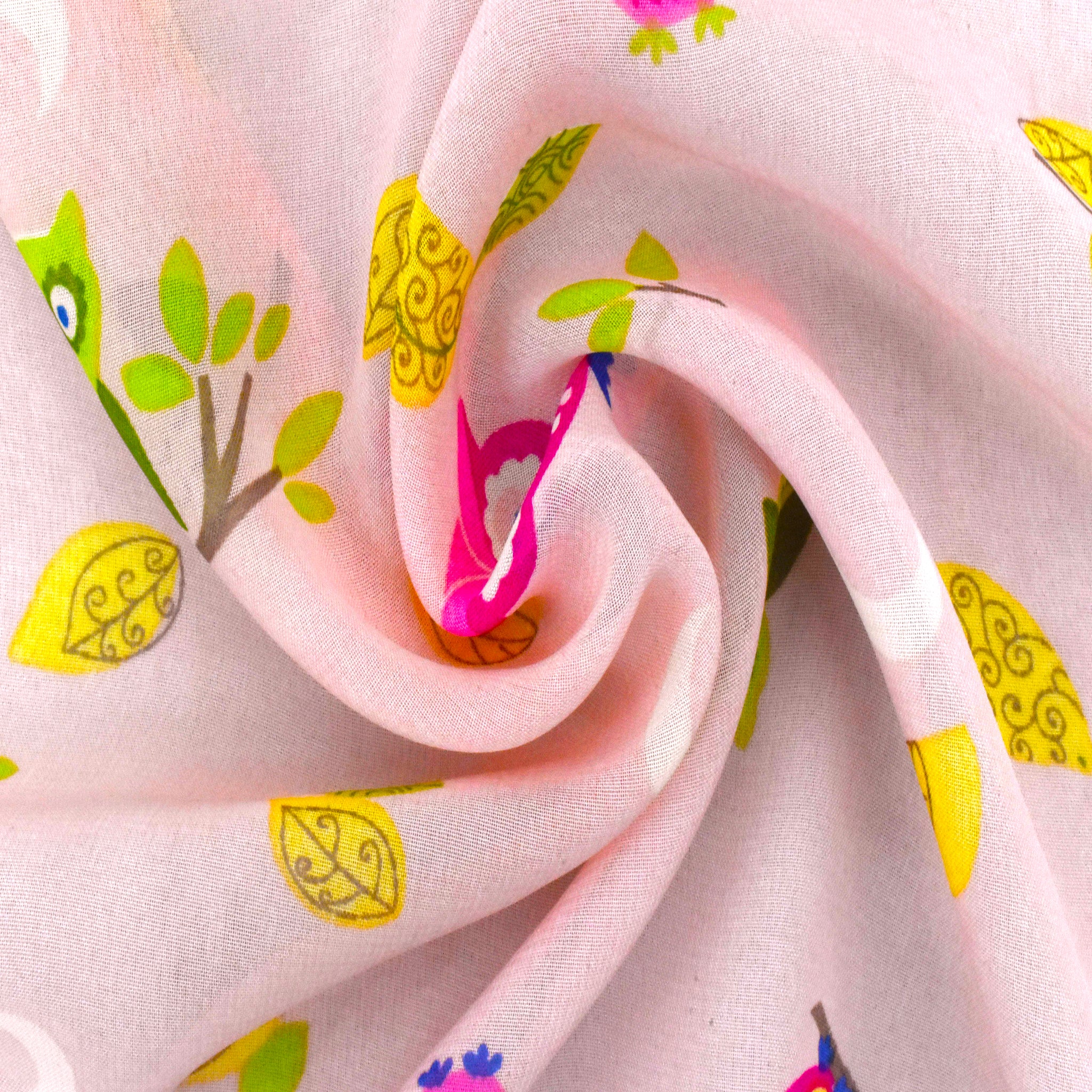 Apricot Pink-Multi Cartoon Owl Leaves Printed Poly Chiffon Woven Fabric
