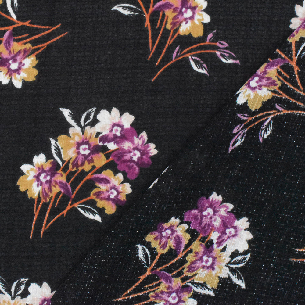 Black-Purple-Multi Floral Printed Poly Grid Slub Chiffon Woven Fabric