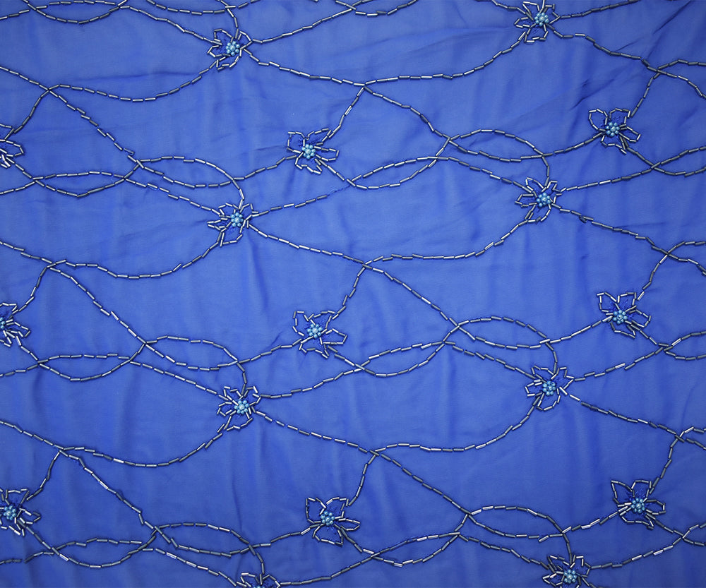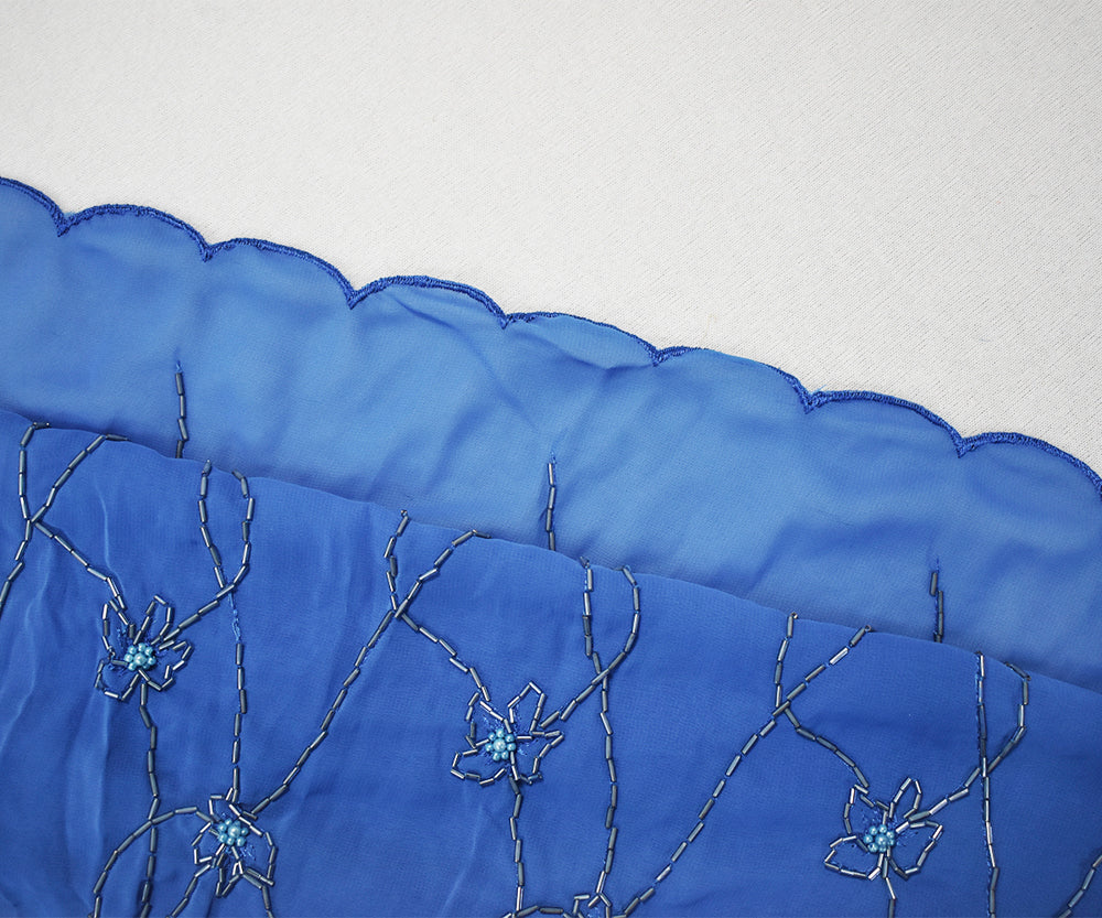 Blue Polyester Beaded Floral Vine Embroidered Scallop Chiffon Woven Fabric
