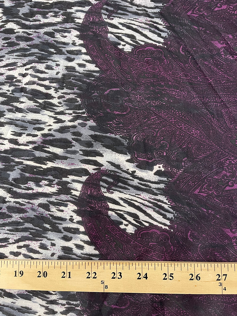 -Black, White, & Gray Zebra Print w/ Burgundy, Purple, & Black Paisley Border Chiffon Fabric