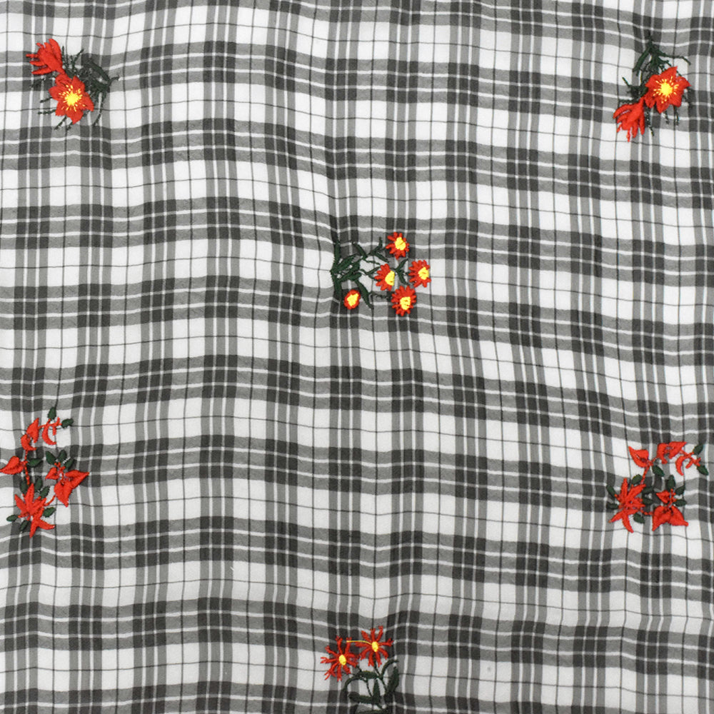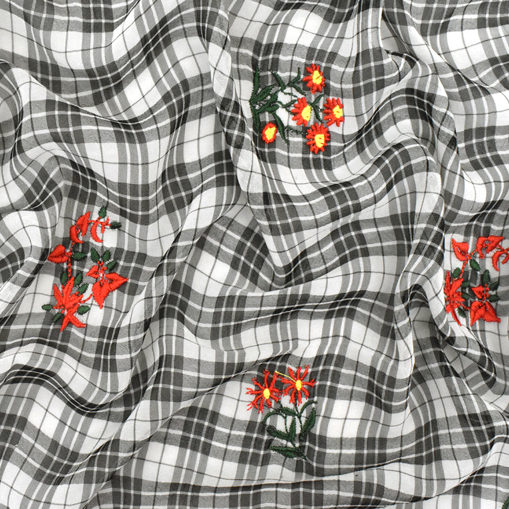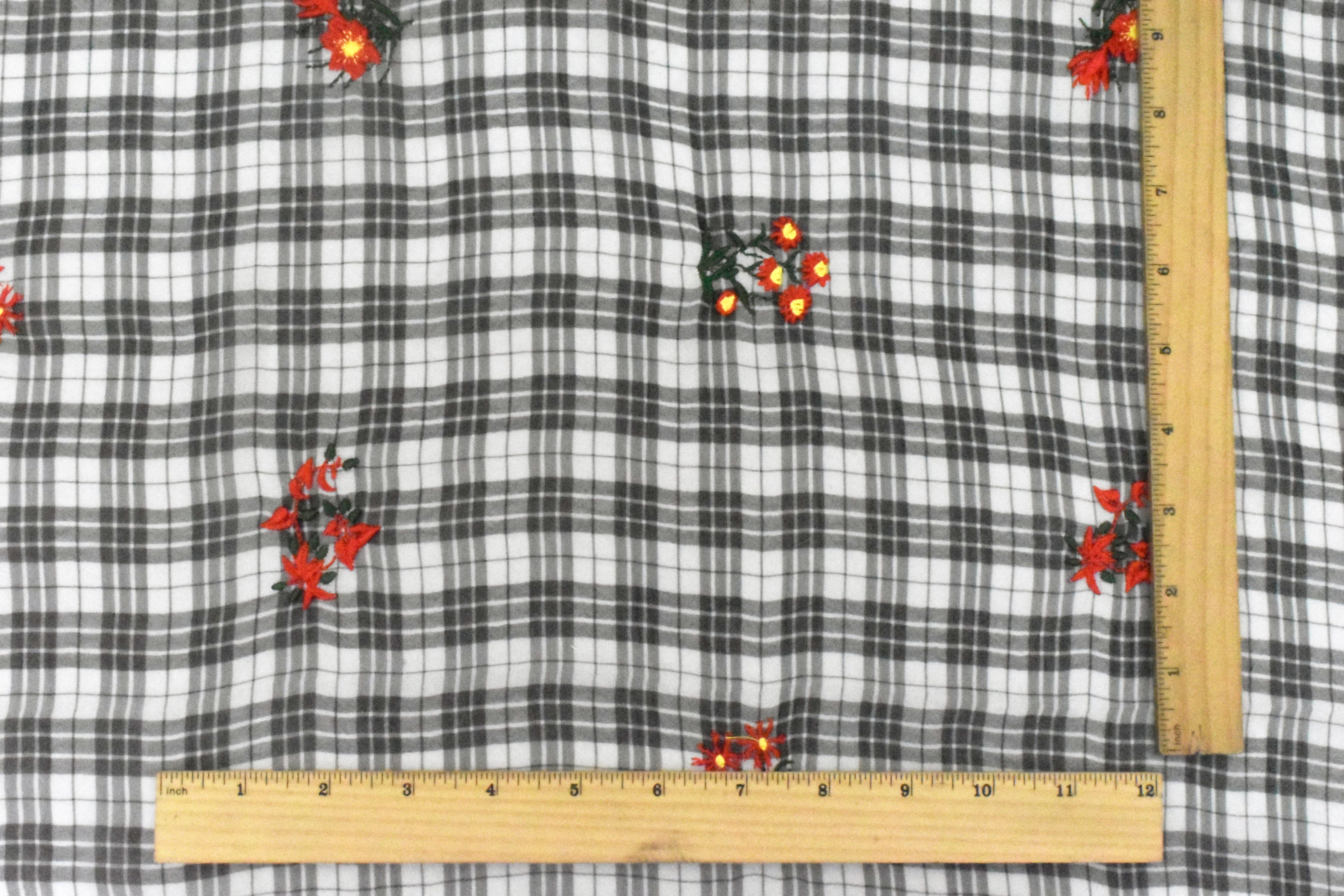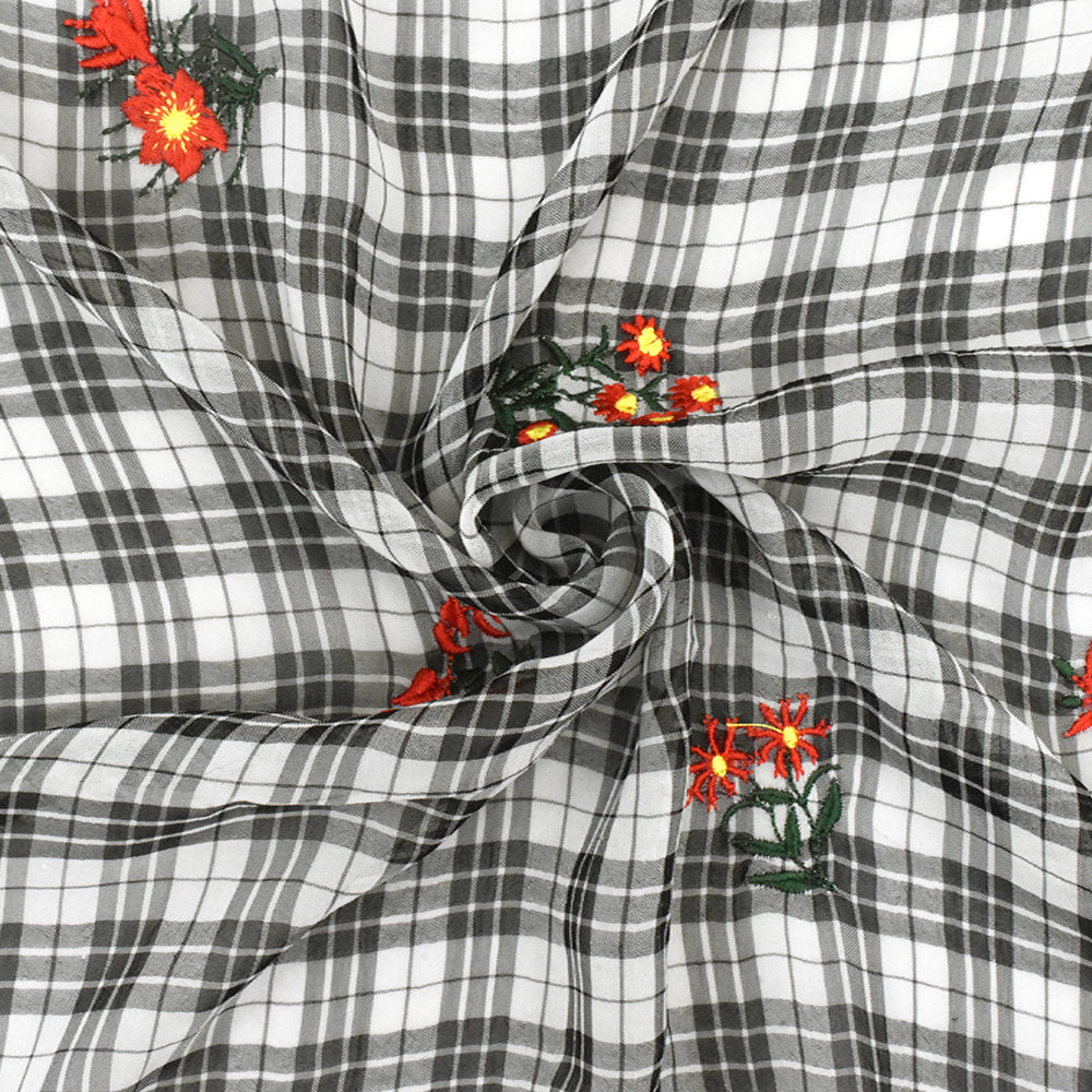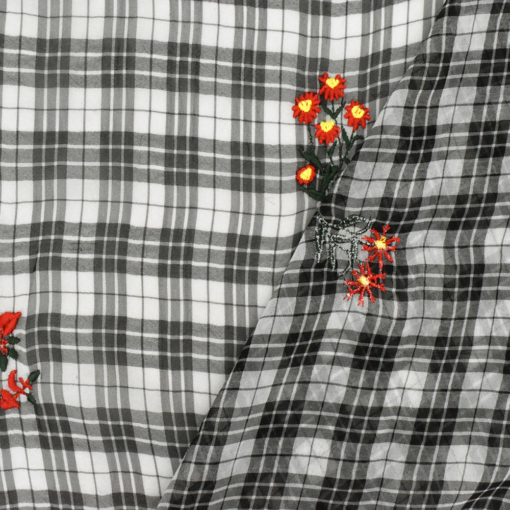 Ivory-Black-Multi Floral Embroidered Plaid Polyester Chiffon Woven Fabric