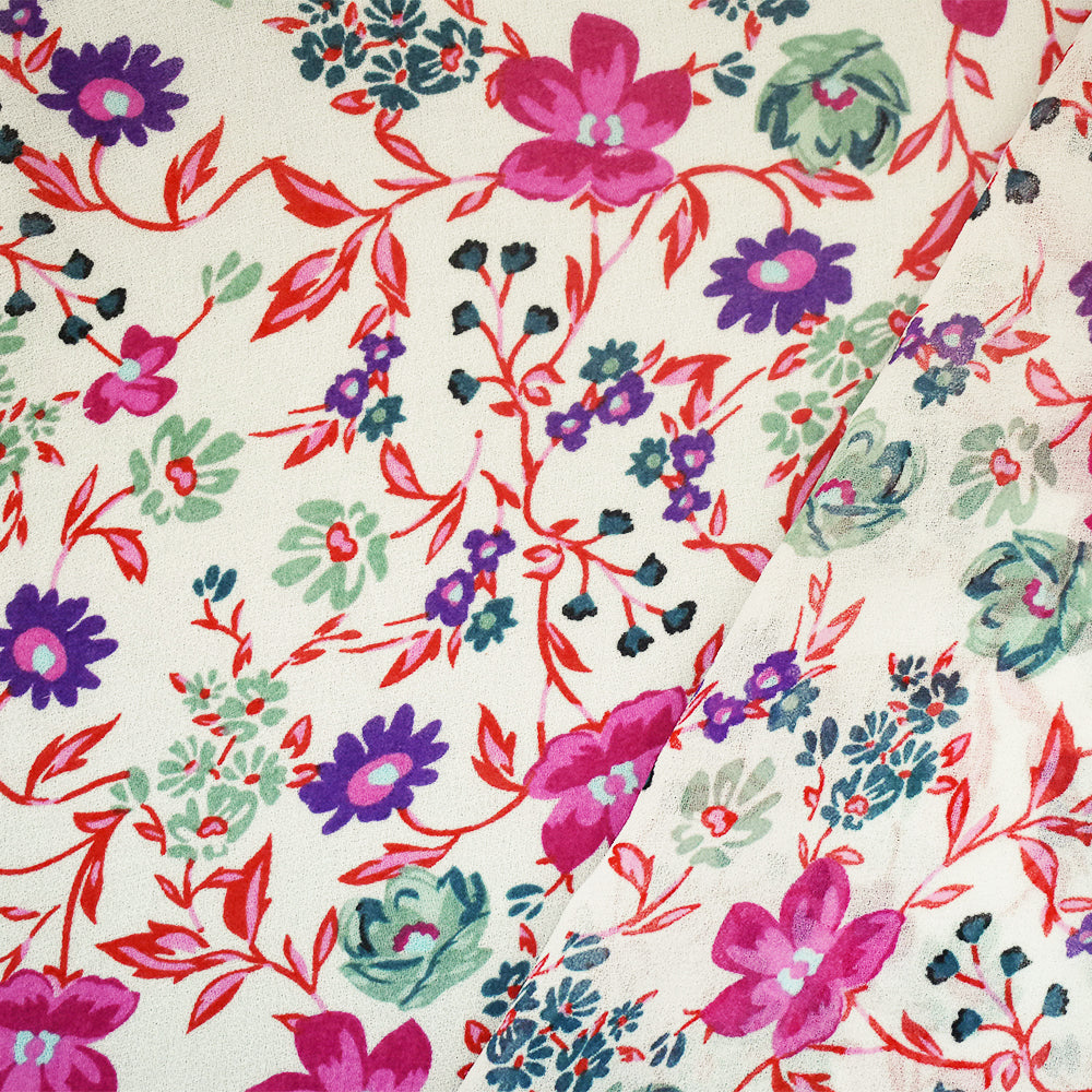 Ivory-Pink-Multi Floral Printed Poly Chiffon Woven Fabric