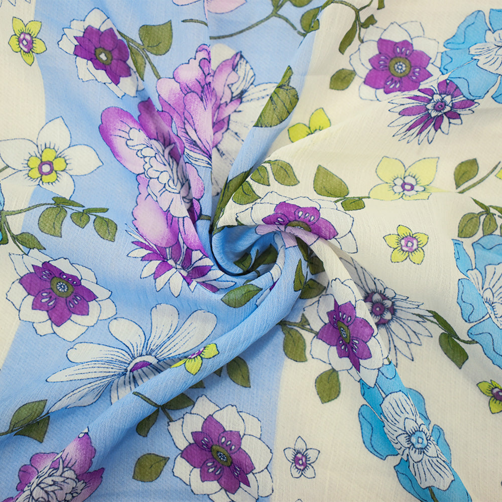 Light Blue-Multi Polyester Floral Printed Yoryu Crinkled Chiffon Fabric