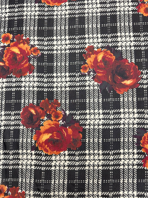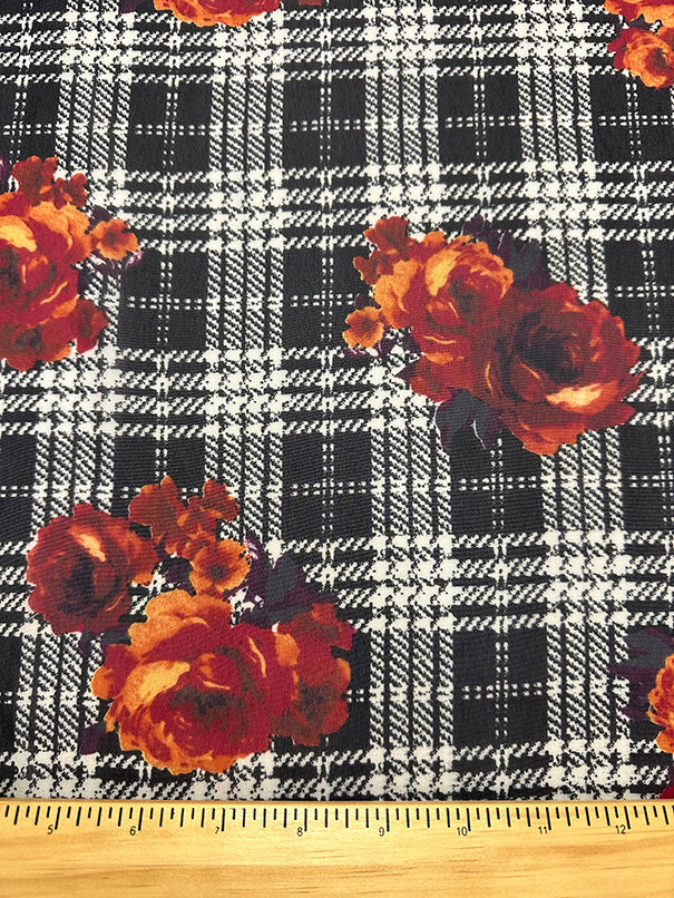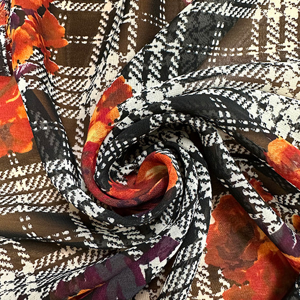 -Orange, Red, & Gold Floral Print on Black & White Plaid Print Sheer Poly Chiffon Fabric