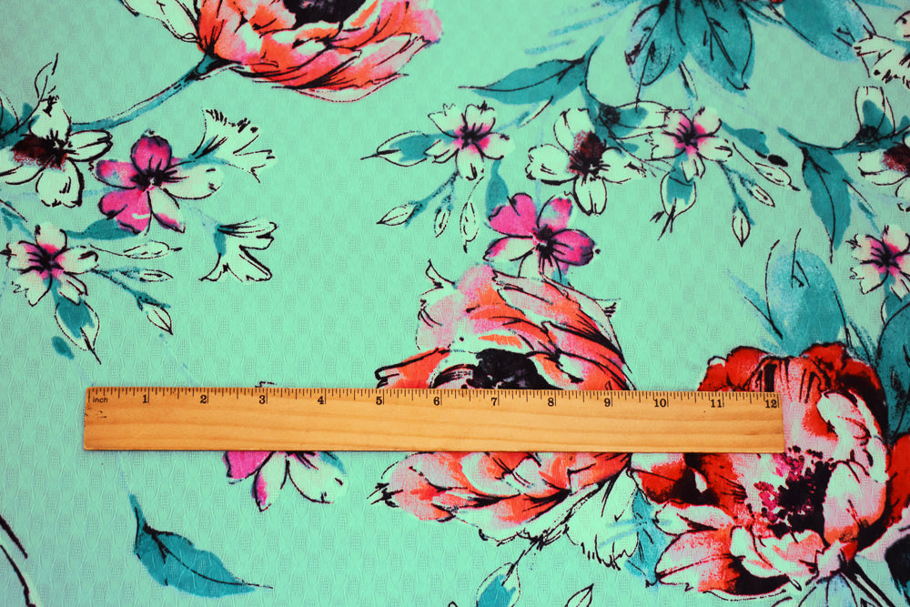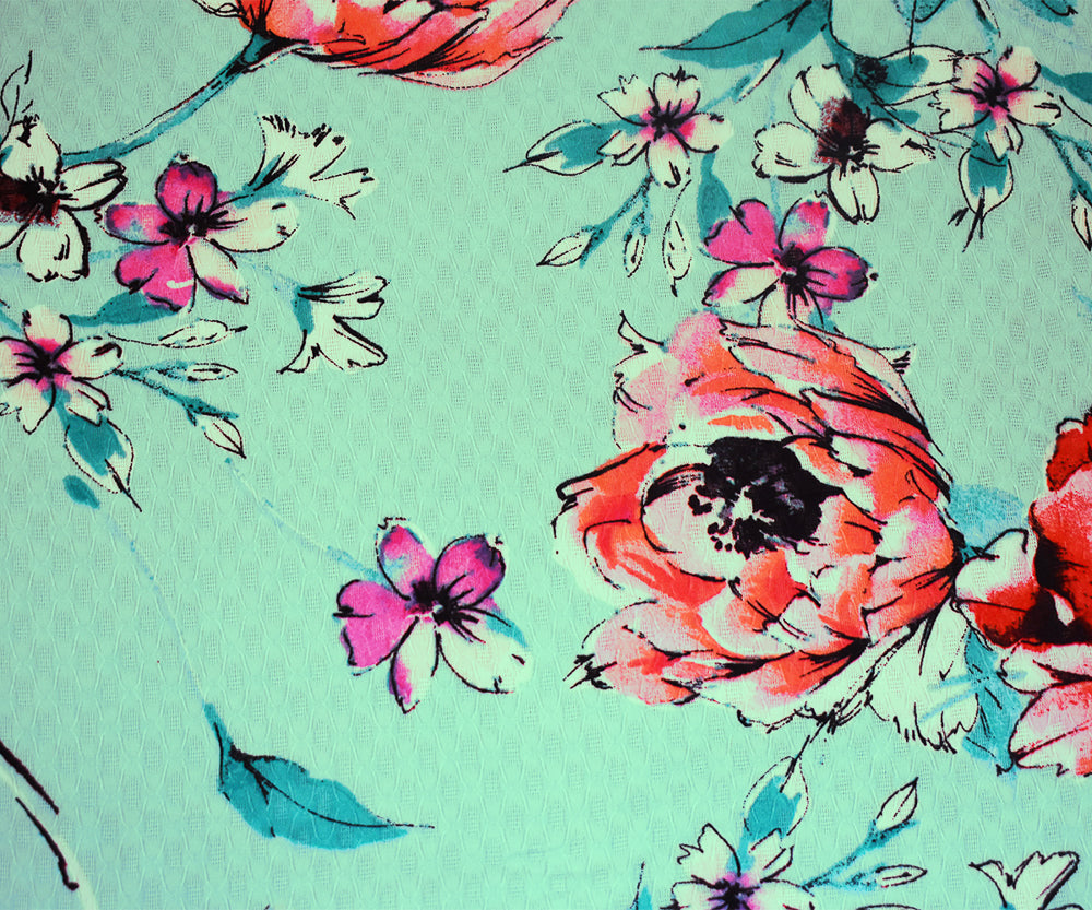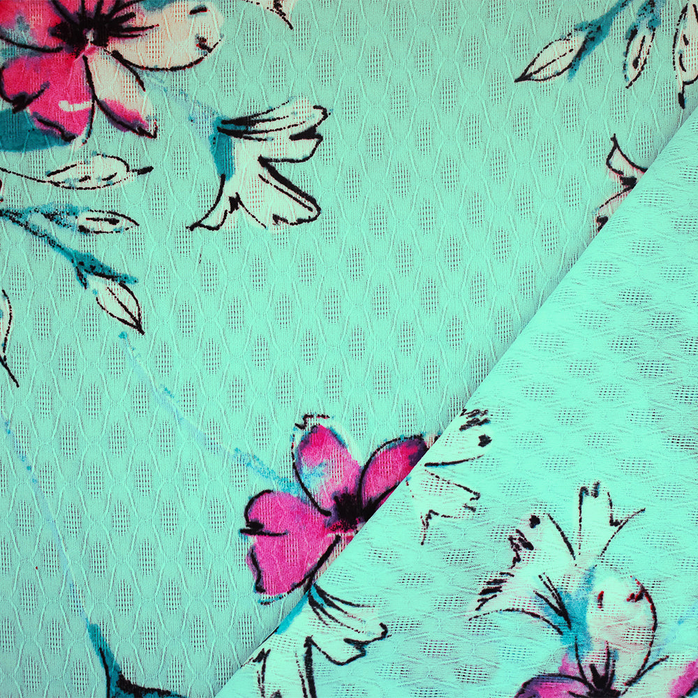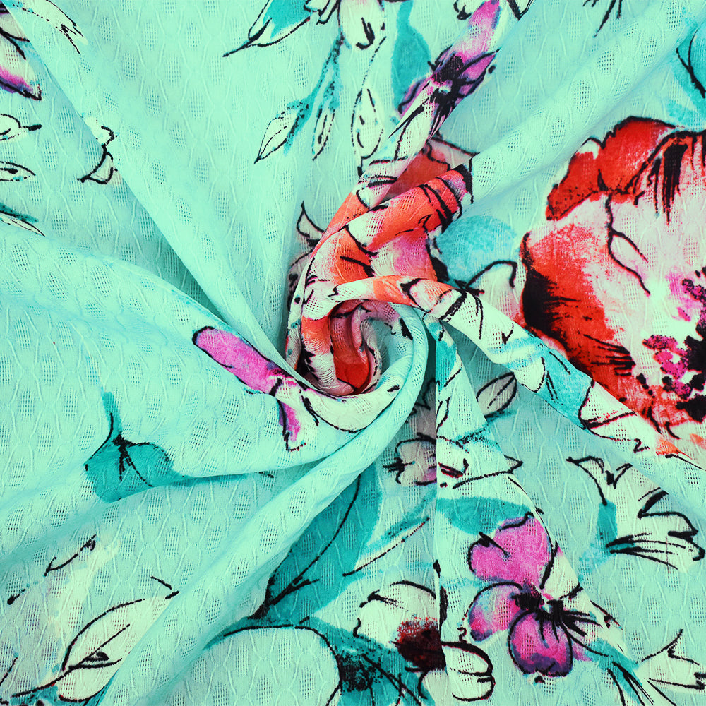 Teal-Pink-Multi Floral Printed Ogee Texture Dobby Chiffon Woven Fabric