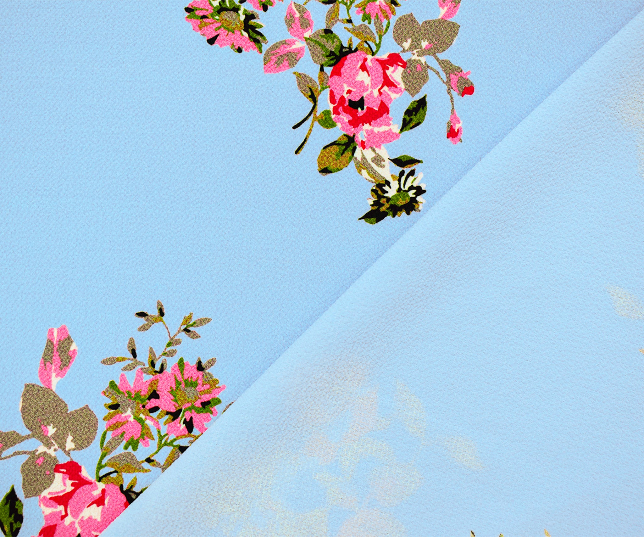 Sky Blue-Pink-Multi Poly Floral Printed Pebble Crepe Woven Fabric