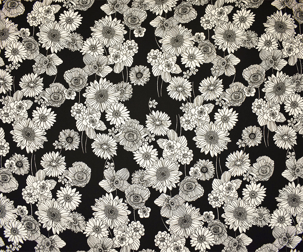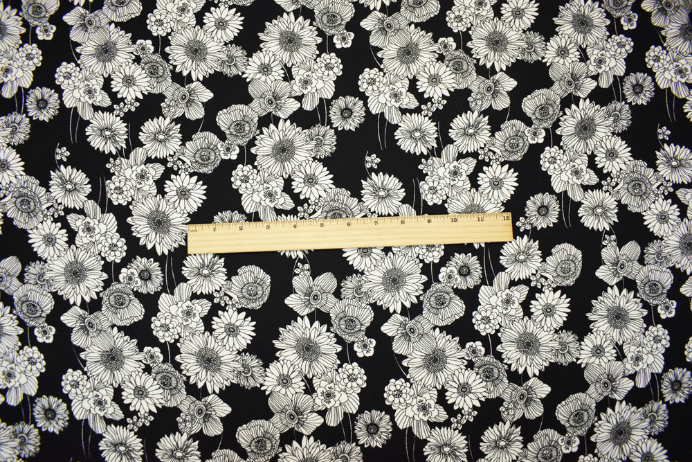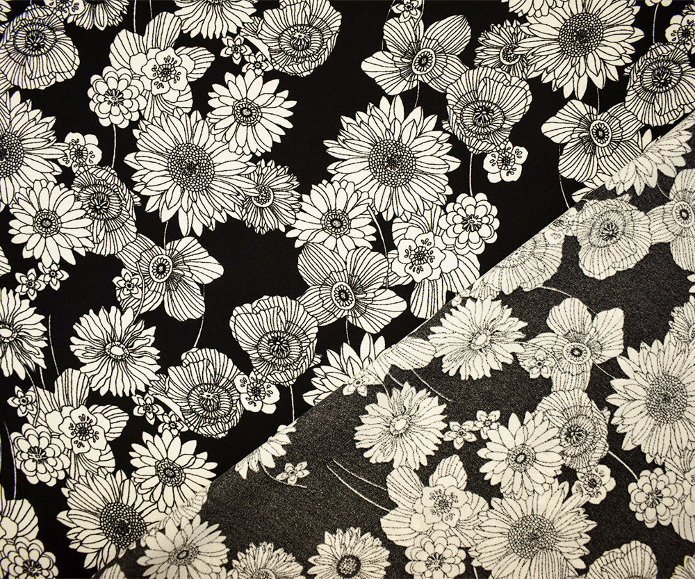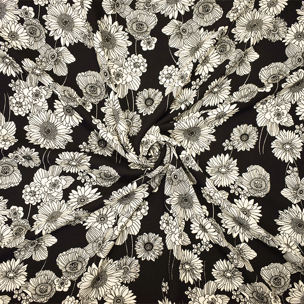 Black-White Poly Floral Printed Crepe Momie Woven Fabric