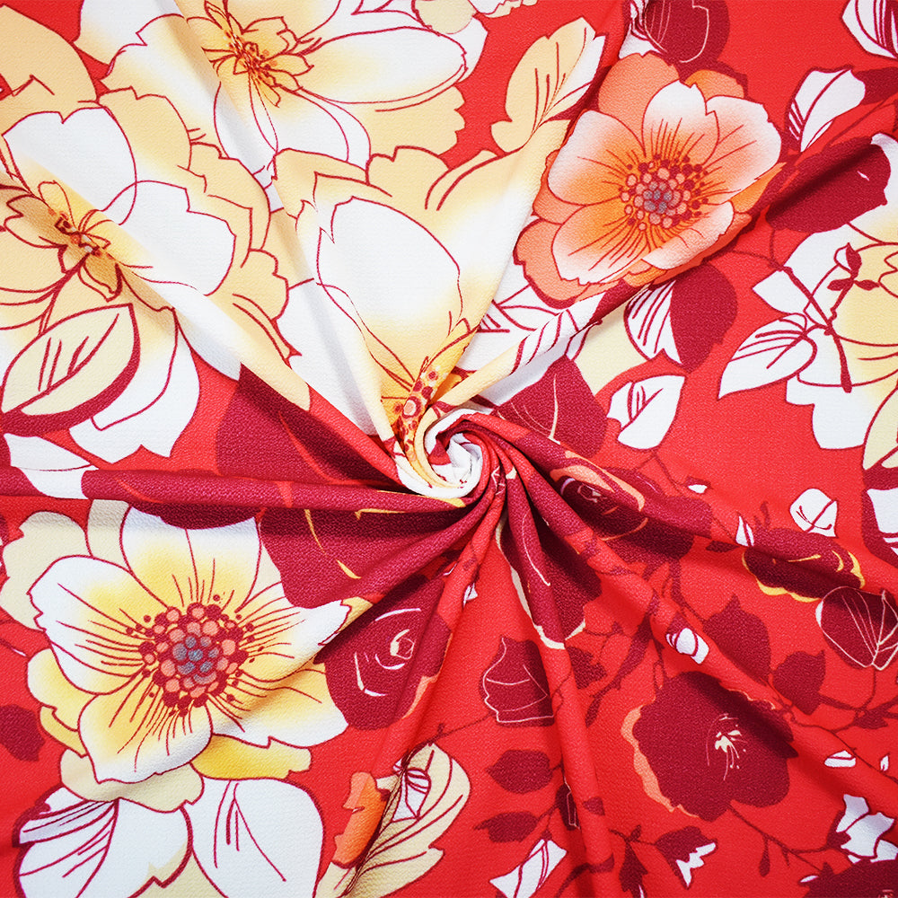 Red-Biege-Multi Poly Floral Printed Pebble Crepe Woven Fabric