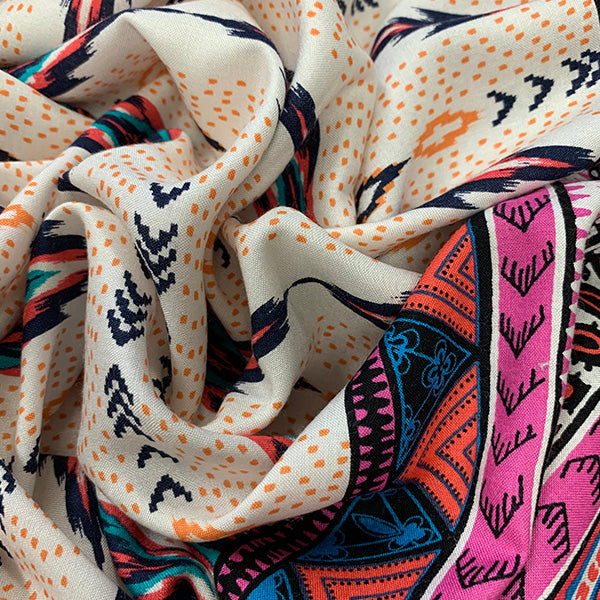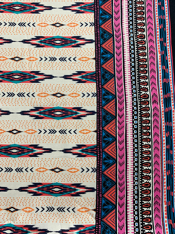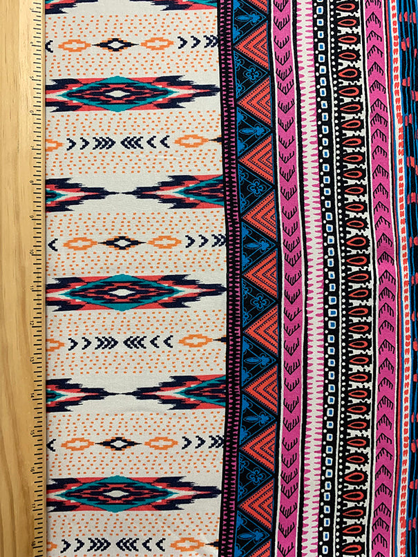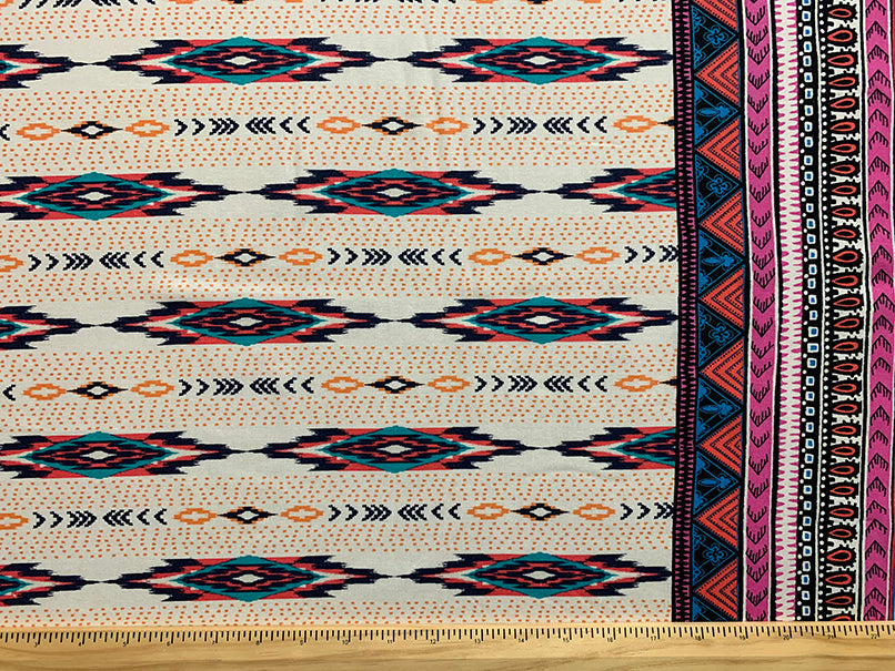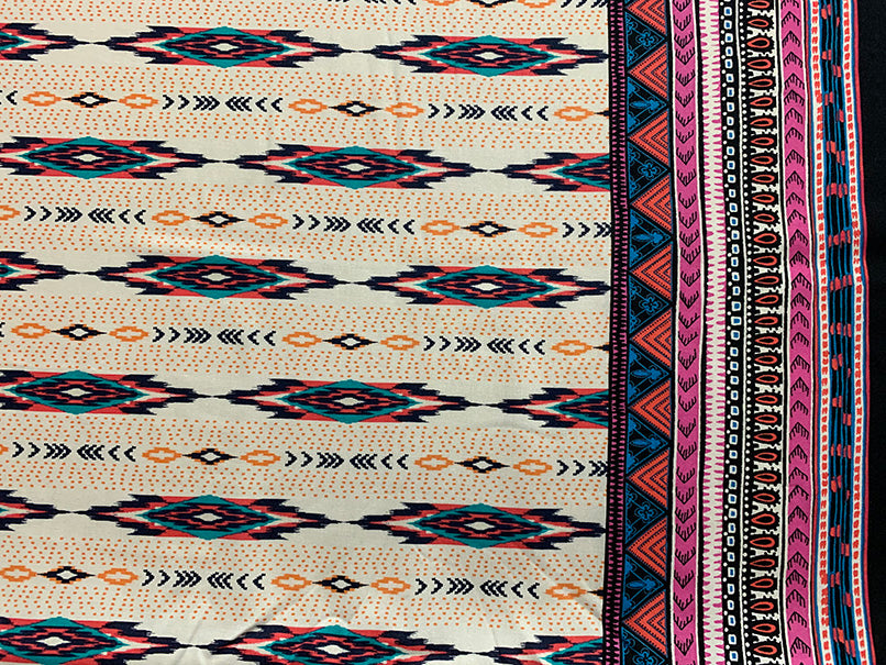-White, Pink, Black, Turquoise, & Red Multi Stripe Print Rayon Challis Fabric w/ 8" border on each selvedge
