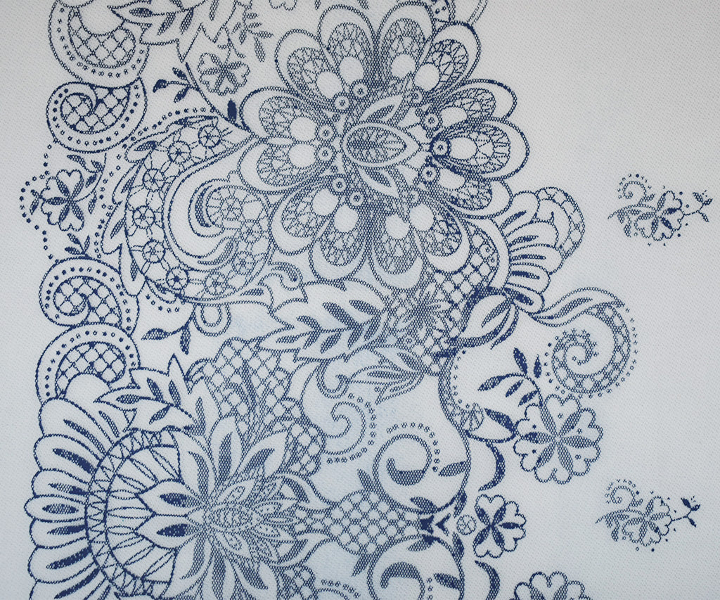 White-Dark Blue Nylon Floral Border Printed Mesh Tulle Fabric