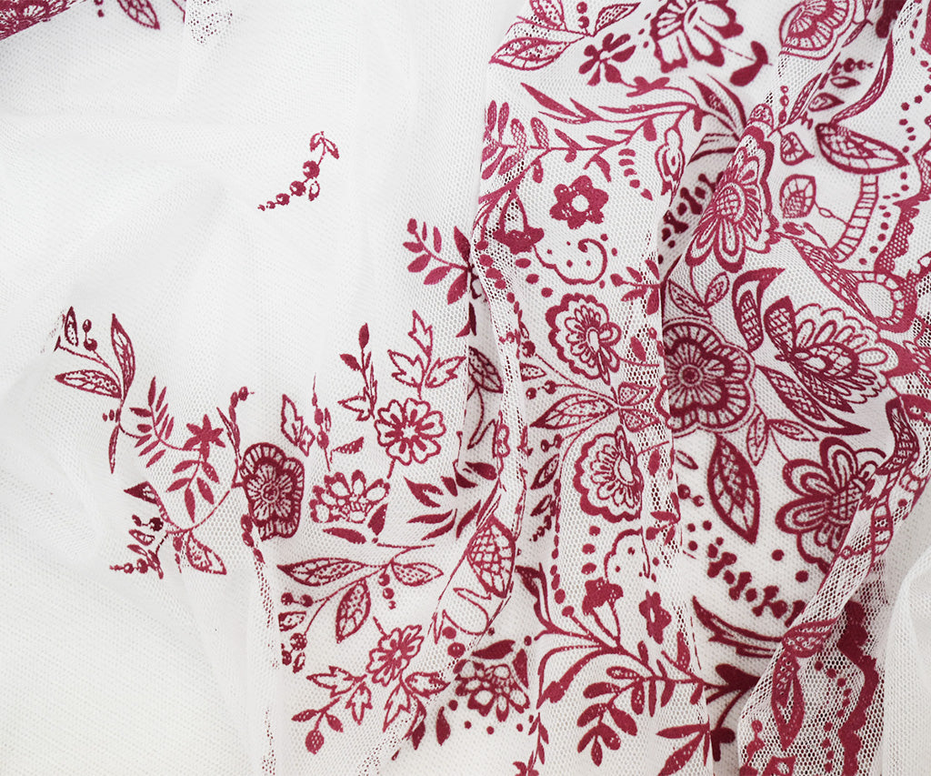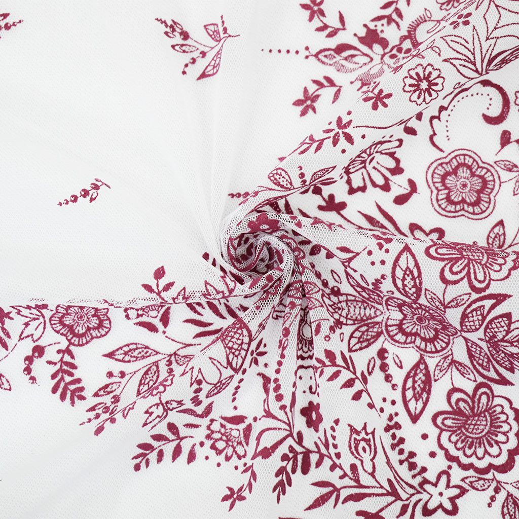 White-Pink Nylon Floral Border Scallop Printed Mesh Tulle Fabric
