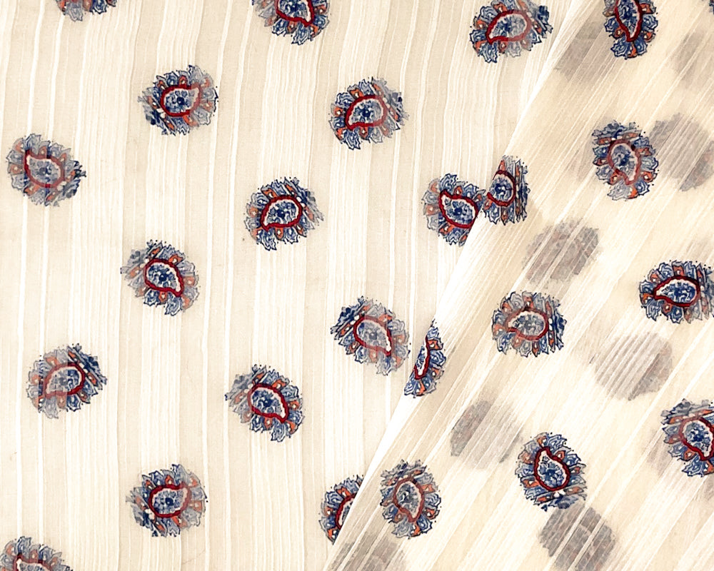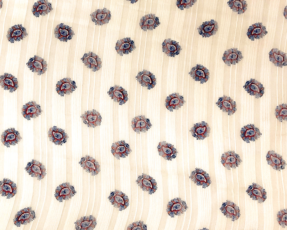 -Ivory-Blue-Multi Poly Paisley Printed Satin Stripe Woven Fabric