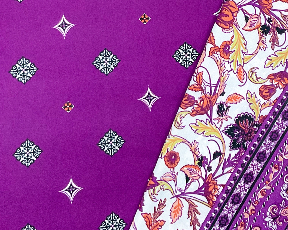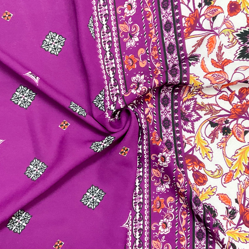 -Purple-Orange-Multi Poly Floral Border Printed Momie Crepe Georgette Woven Fabric